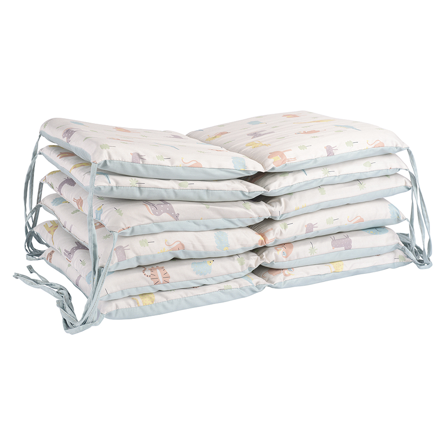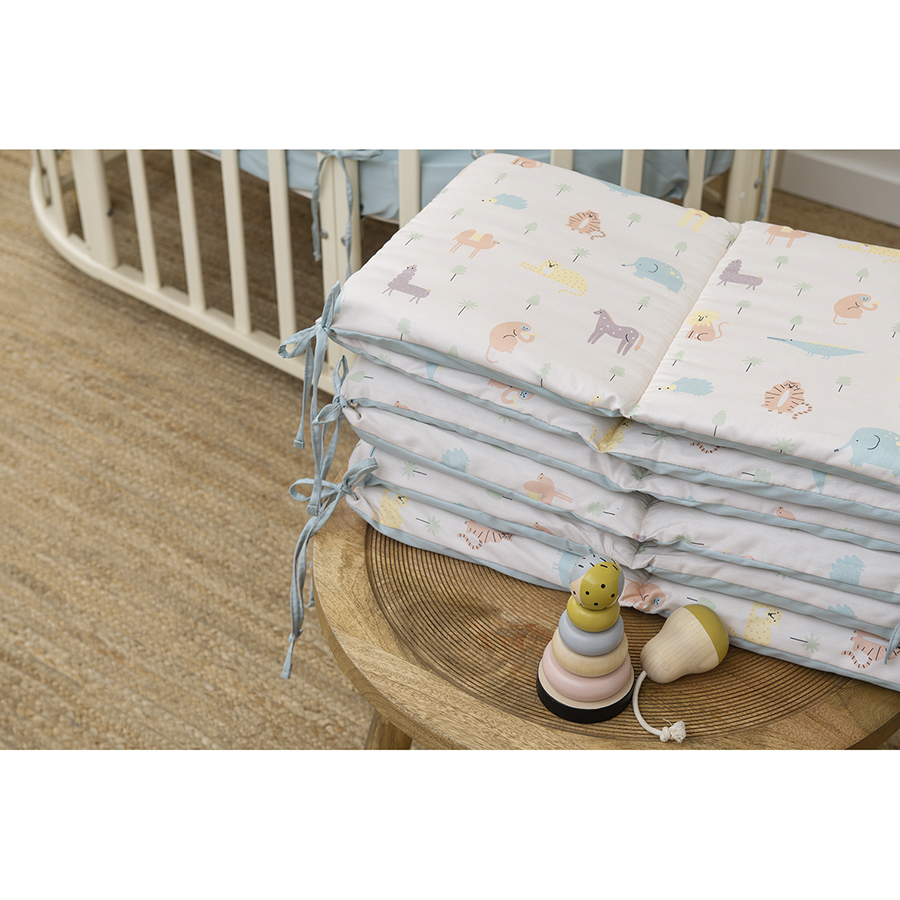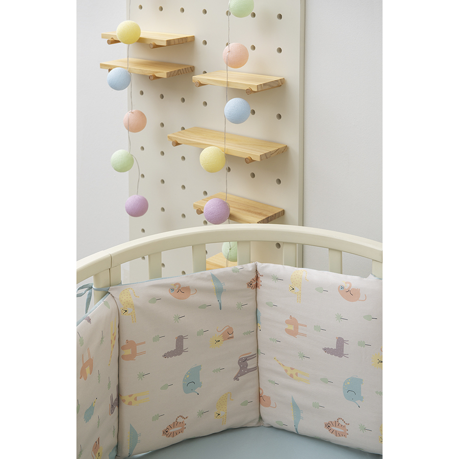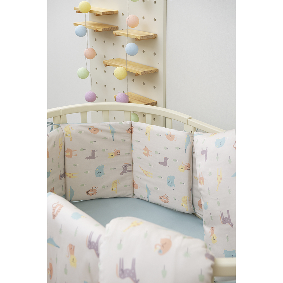 "Бортик в кроватку из сатина с принтом Animalia world из коллекции Tiny world сделает первую кроватку малыша особенно уютной и безопасной: защитит от случайного сквозняка, немного приглушит внешние звуки и свет, прикроет жесткое ограждение кроватки. Принт нанесен на обе стороны бортика. Изделие подойдет для обычной и для круглой кроватки-трансформера, состоит из 6 секций по 2 «подушечки» и крепится к кроватке прочными завязками. Бортики будут сочетаться с любым постельным бельем.