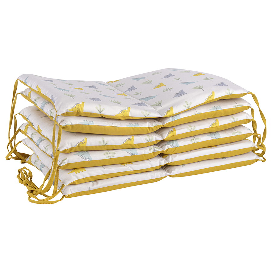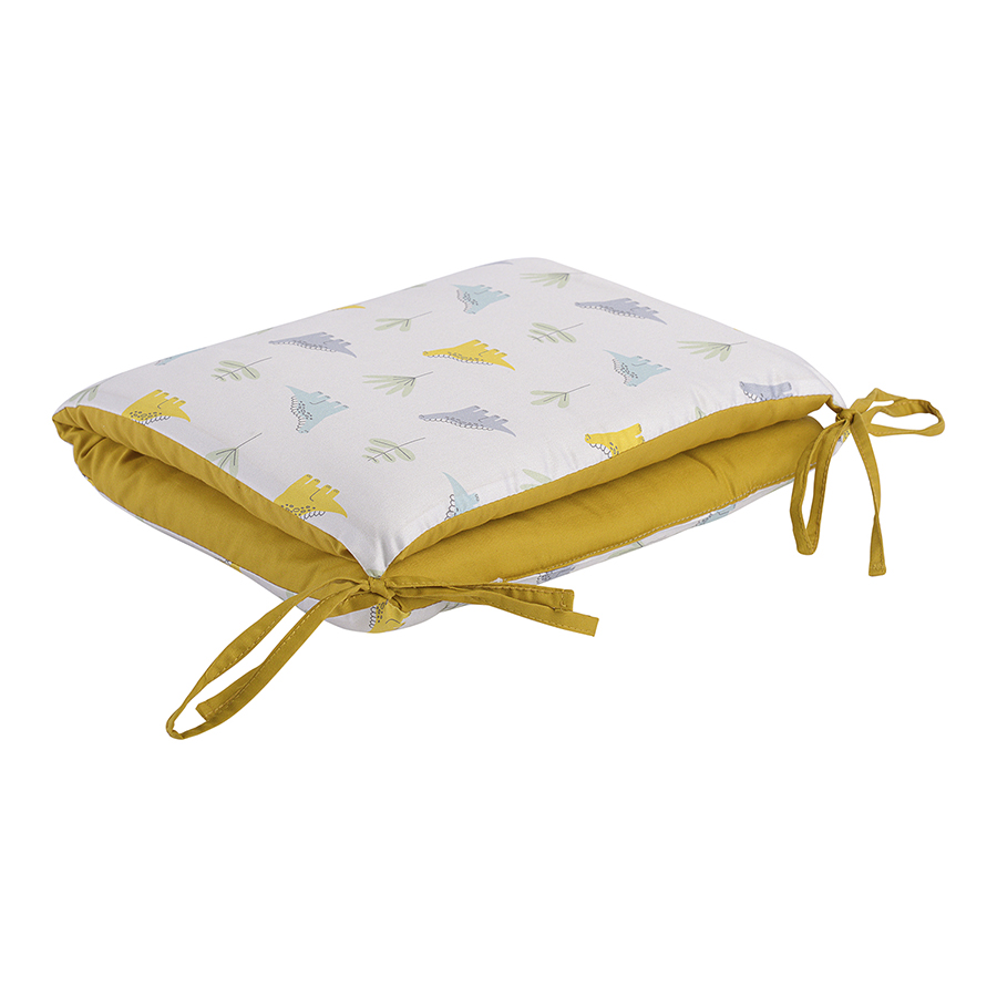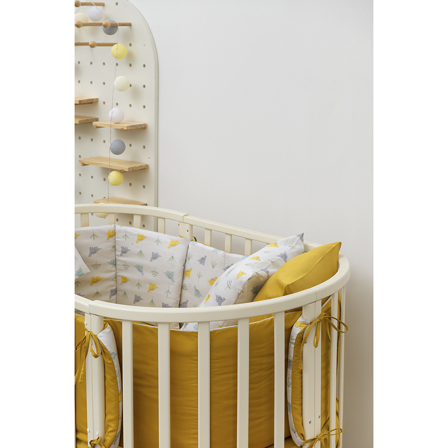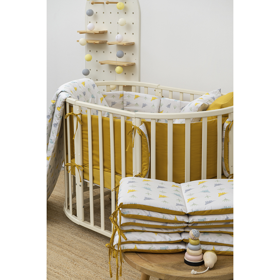 "Бортик в кроватку из сатина с принтом Dinosauria world из коллекции Tiny world сделает первую кроватку малыша особенно уютной и безопасной: защитит от случайного сквозняка, немного приглушит внешние звуки и свет, прикроет жесткое ограждение кроватки. Принт нанесен на обе стороны бортика. Изделие подойдет для обычной и для круглой кроватки-трансформера, состоит из 6 секций по 2 «подушечки» и крепится к кроватке прочными завязками. Бортики будут сочетаться с любым постельным бельем.