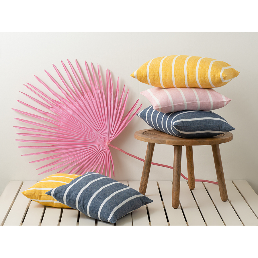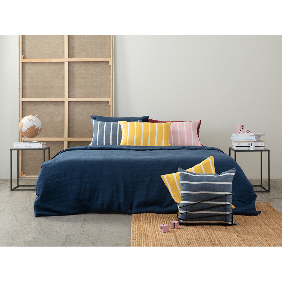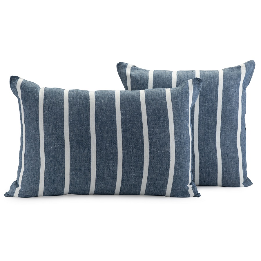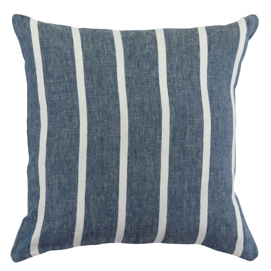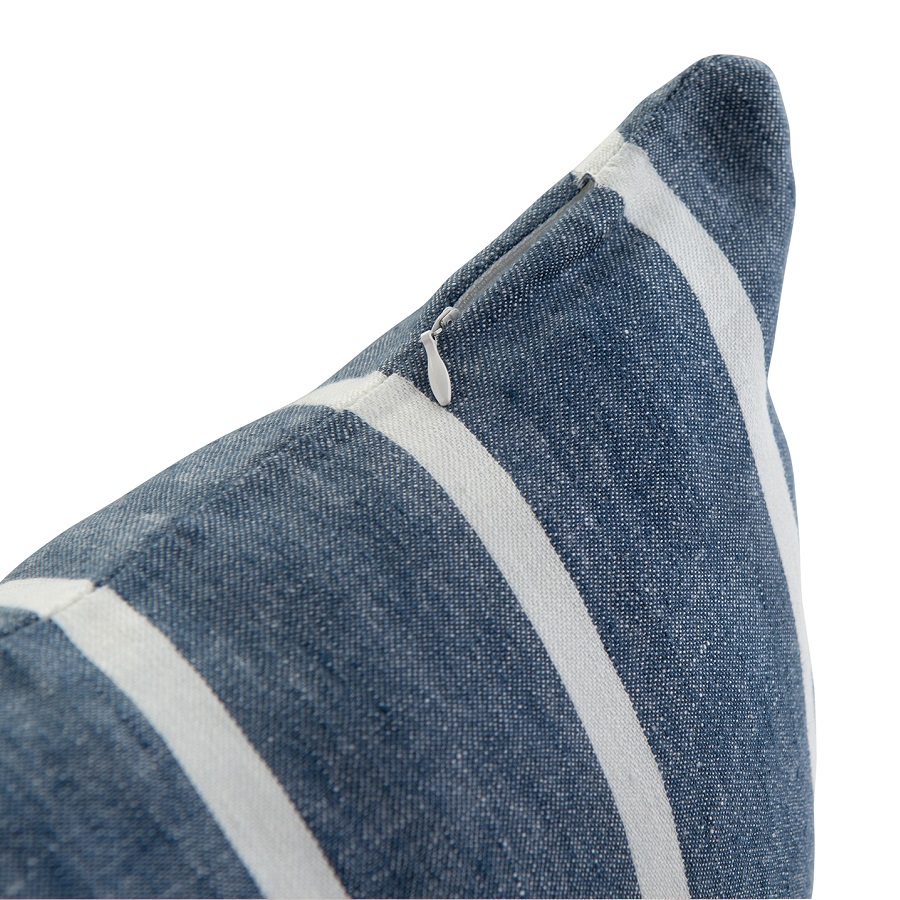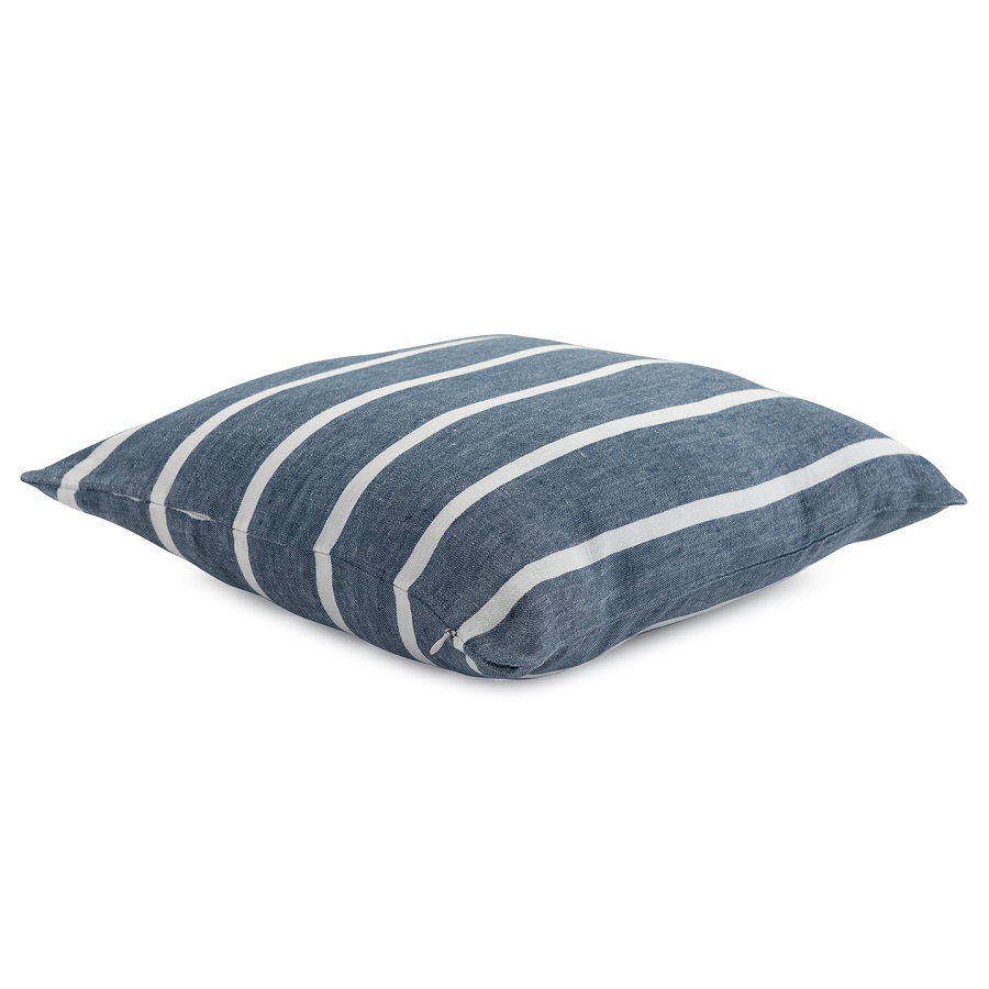 "Чехол на декоративную подушку в полоску темно-синего цвета из коллекции Essential добавит ярких красок и настроения в ваш интерьер. Он выполнен изо льна, гипоаллергенного материала, который прост в уходе и долгое время сохраняет презентабельный внешний вид. Практичный чехол темно-синего оттенка впишется в любой интерьер и будет хорошо сочетаться с остальными подушками. Модель застегивается на потайную молнию.