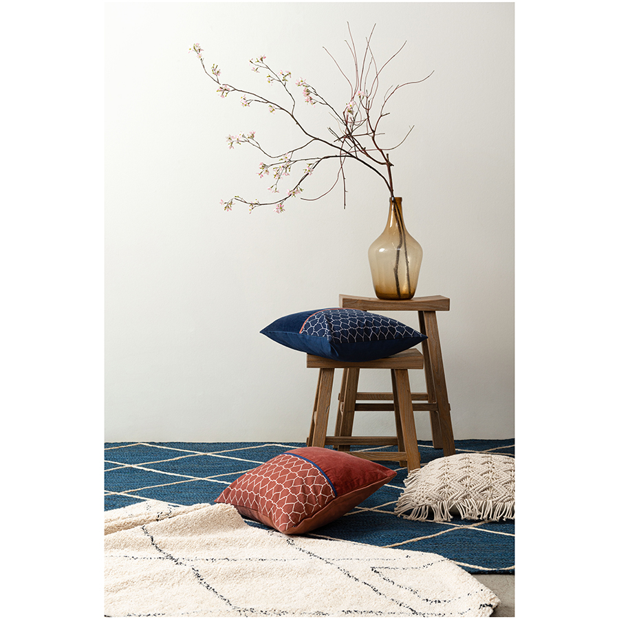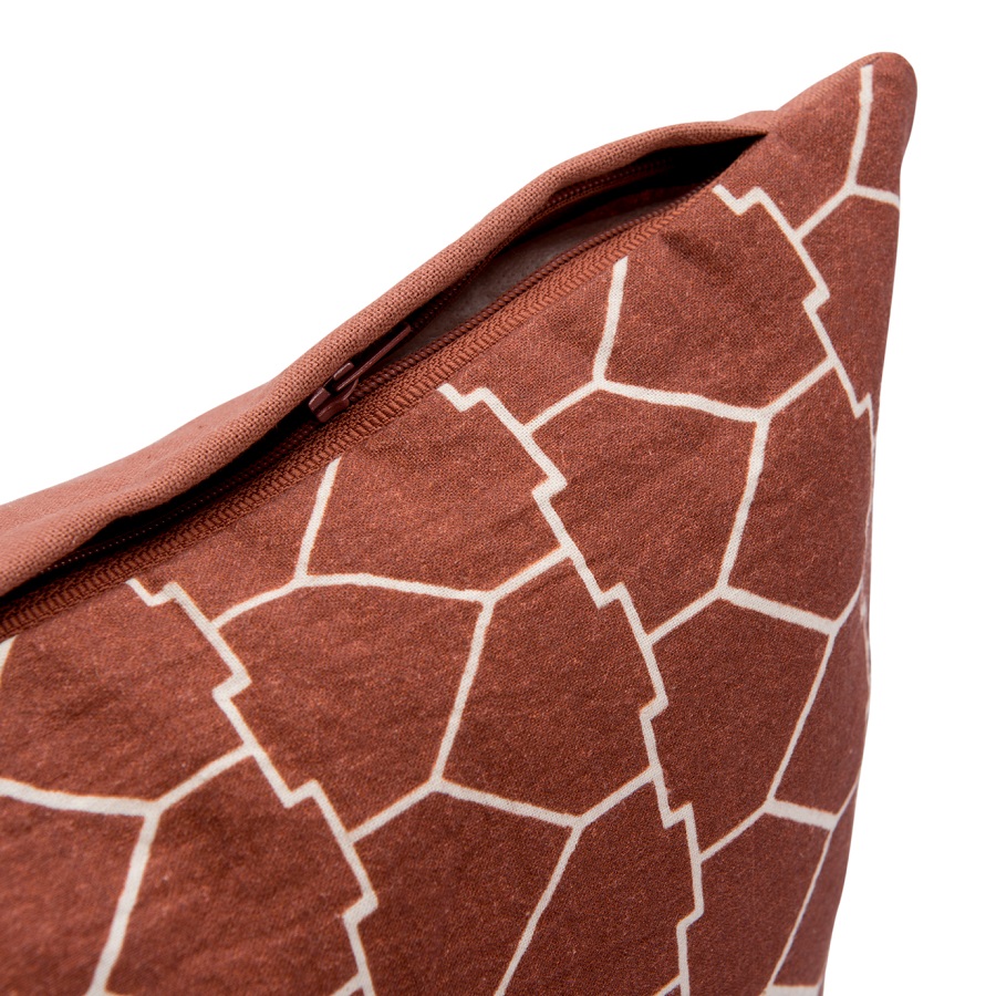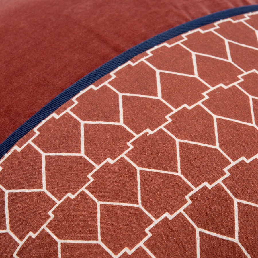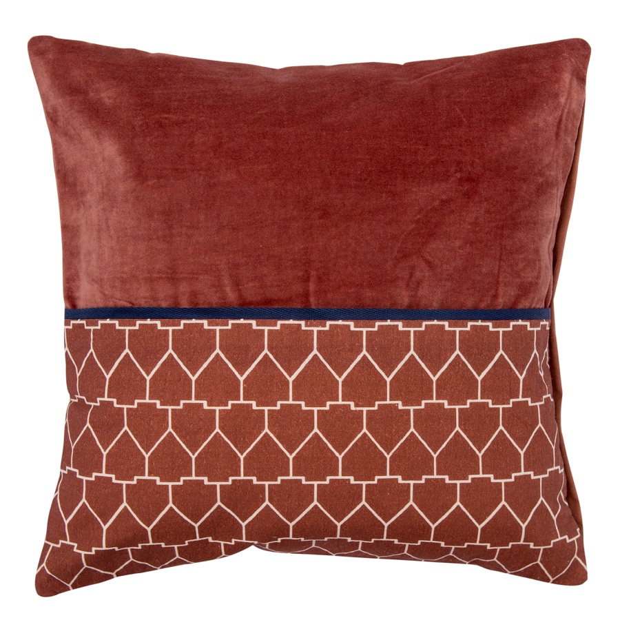 "Чехол на подушку из хлопкового бархата с геометрическим принтом терракотового цвета из коллекции Ethnic добавит уюта интерьеру гостиной и спальни. Лицевая сторона состоит из принтованной и однотонной частей, поэтому изделие легко сочетать с любым другим декоративным текстилем. Нежный, приятный на ощупь хлопковый бархат прост в уходе и не электризуется. Застёжка – потайная молния в боковом шве.