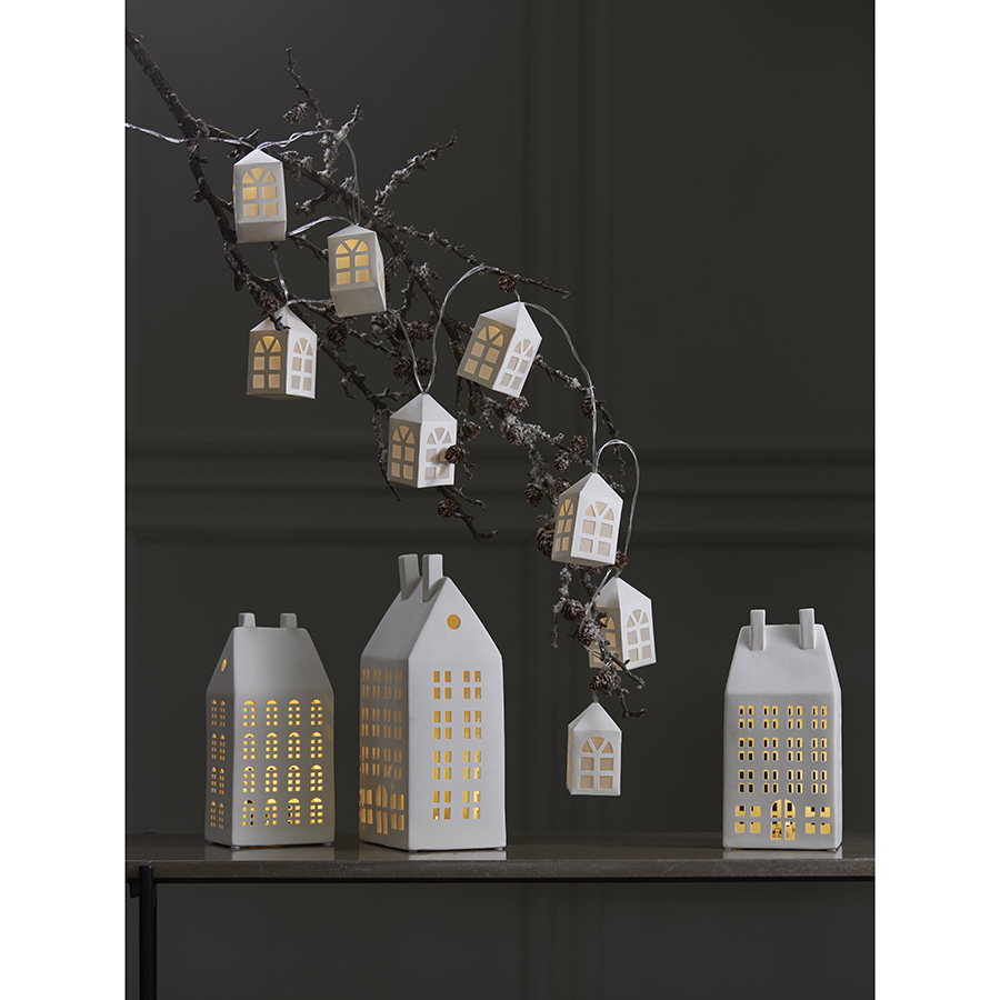 "Домик из фарфора Aalborg из коллекции New Year Essential – не просто украшение, а символ волшебства, надежды и семейного благополучия. Разместите его на праздничном столе, полке или окне, и он сразу преобразит пространство, создав атмосферу тепла и уюта. Благодаря подсветке с мягким свечением такой декор идеально подойдет в качестве ночника и станет отличной альтернативой свечам. Изделие из фарфора отличается прочностью, долговечностью и привлекательным внешним видом. Аксессуар изготовлен с любовью, которую вы непременно почувствуете, как только откроете коробку. В комплекте 3 батарейки LR44.