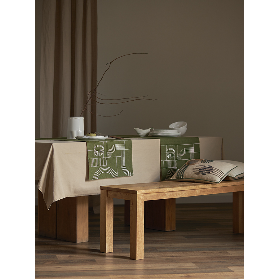 "Дорожка на стол Cave maze из коллекции Ethnic превратит обыденную сервировку в праздничную. Благодаря спокойной цветовой гамме она легко сочетается с посудой и салфетками любых оттенков. Текстильное изделие можно размещать поверх скатерти или непосредственно на столешнице.