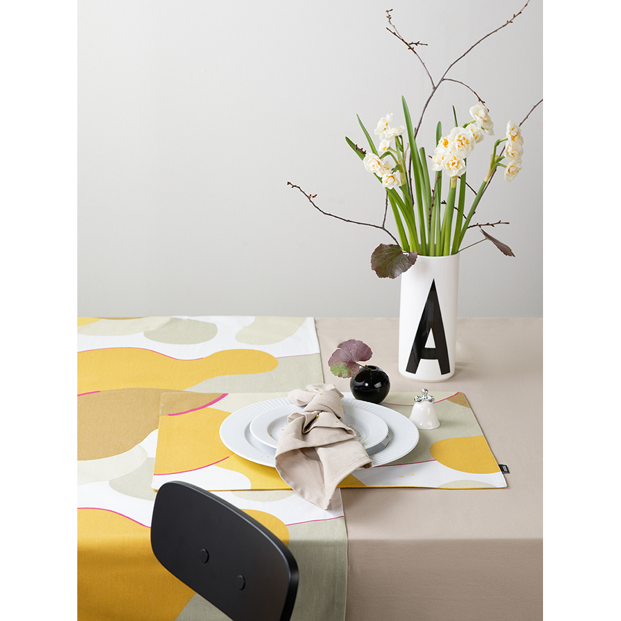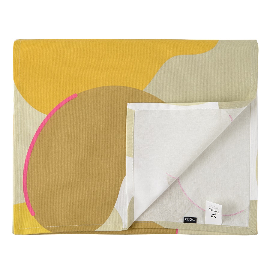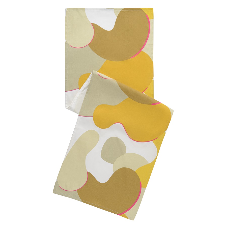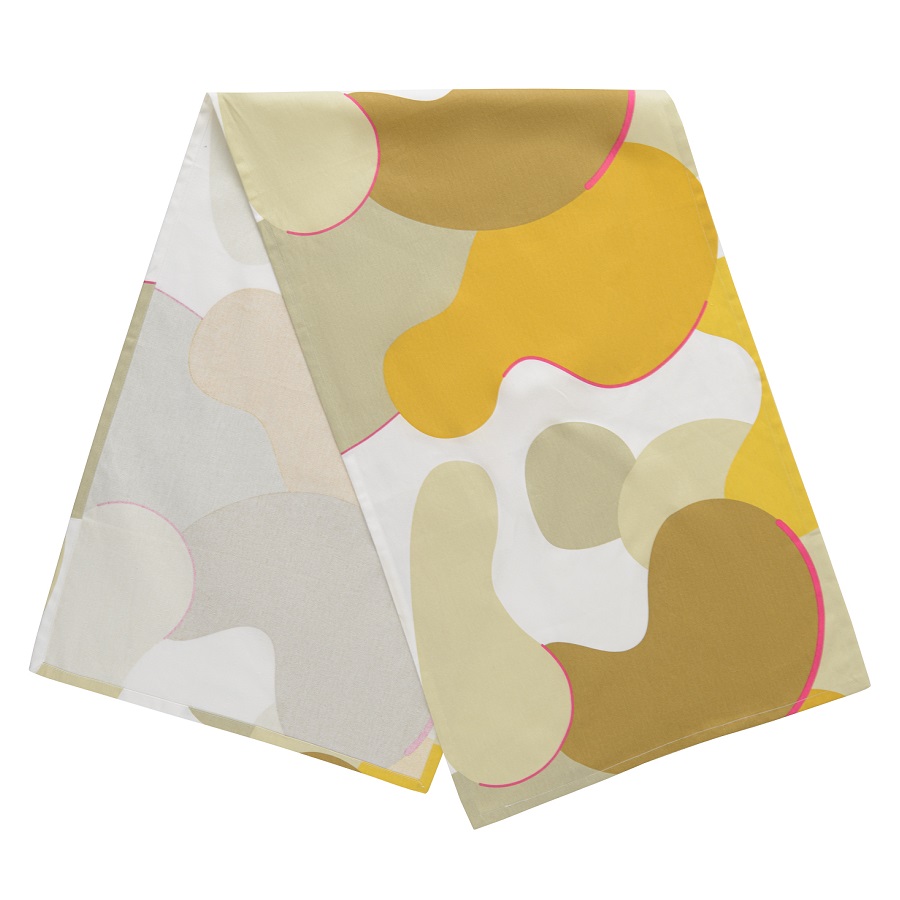 "Дорожка на стол из хлопка горчичного цвета с авторским принтом из коллекции Freak Fruit гармонично дополнит повседневную и праздничную сервировку и впишется в любой современный интерьер. Абстрактный принт не имеет повторяющегося раппорта и представляет собой единую законченную картину.