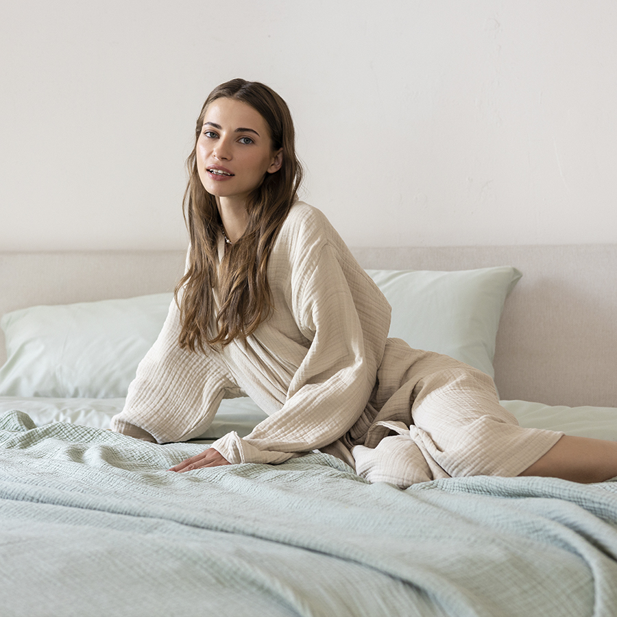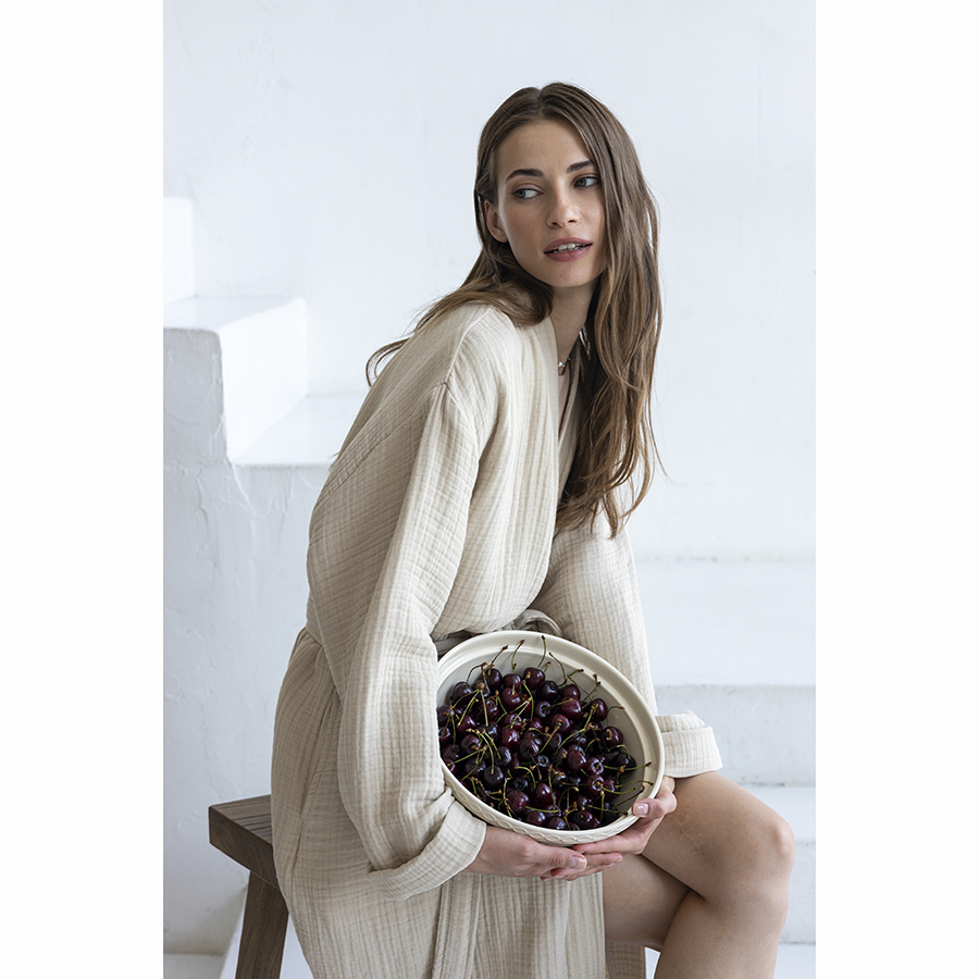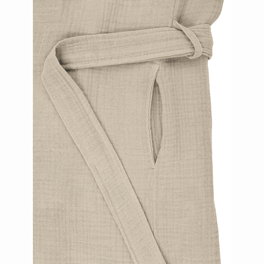 "Халат из многослойного муслина бежевого цвета из коллекции Essential станет прекрасным выбором для ценителей качественного кроя и натуральных материалов. Мягкий, приятный к телу материал, изготовленный из 100%, хлопкового волокна, позволяет коже дышать, хорошо впитывает и отводит влагу, быстро сохнет. Такой халат дарит чувство легкости и комфорта после ванны, душа, сауны или бассейна. За счет специального переплетения нитей в каждом из четырех слоев ткань имеет интересную мятую фактуру, обладает высокой плотностью, устойчивостью к износу, не скатывается и хорошо держит форму. Модель с шалевым воротником дополнена двумя карманами и широким поясом.