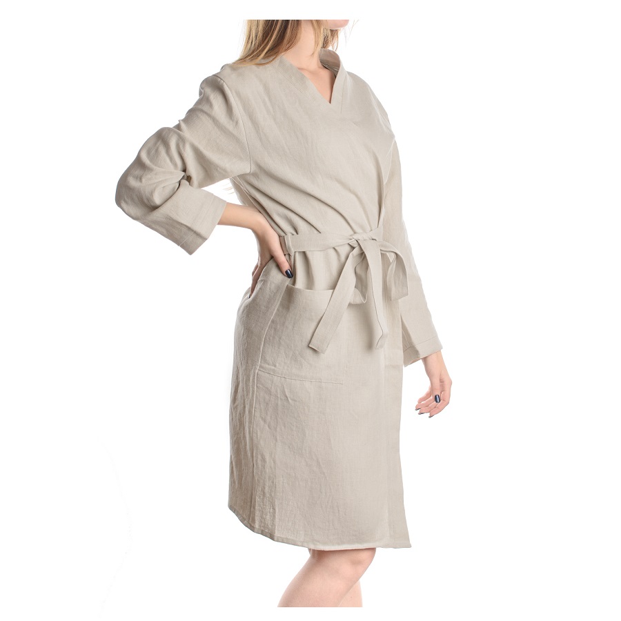 "Халат из умягченного льна подарит ощущение нежности и уюта после водных процедур. Приятное к телу изделие отличается высокой гигроскопичностью: легкий и при этом прочный лен хорошо впитывает влагу и пропускает воздух. Банный аксессуар обязательно понравится тем, кто заботится о своем комфорте и ценит качественные ткани. Изделие с двумя накладными карманами фиксируется длинным поясом в тон. Плотность ткани - 280GSM.
