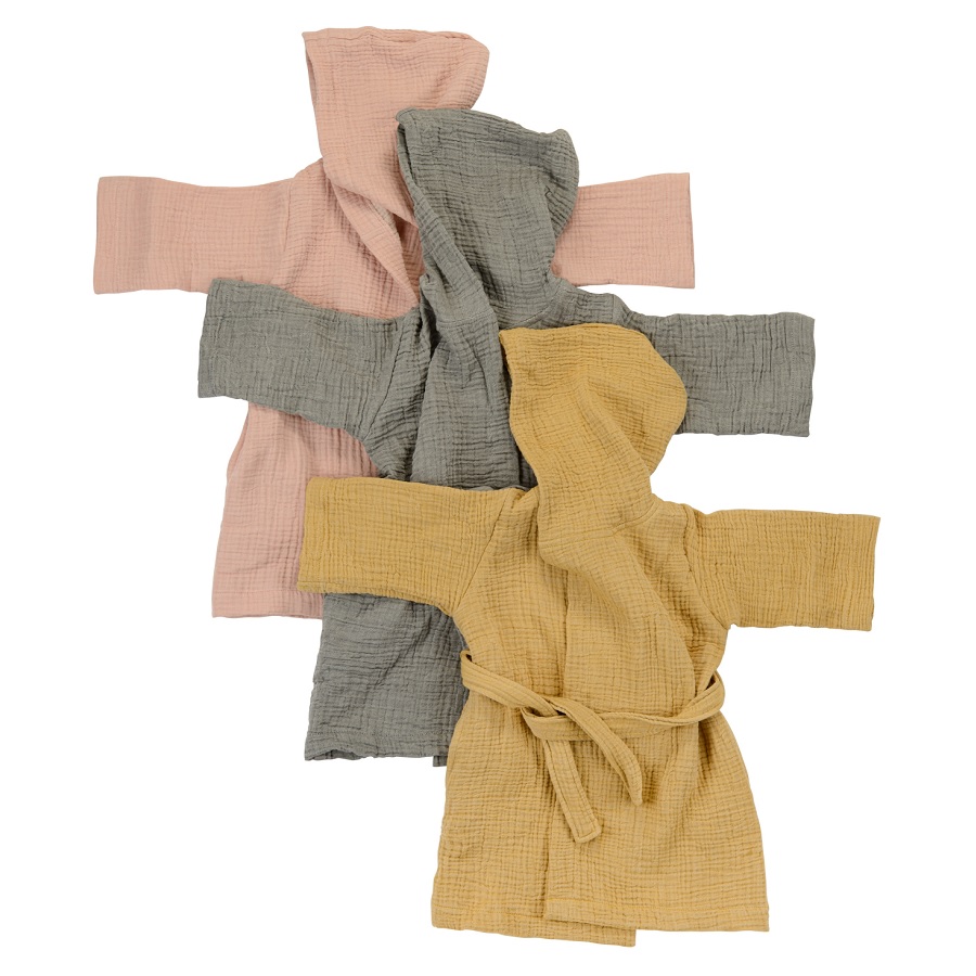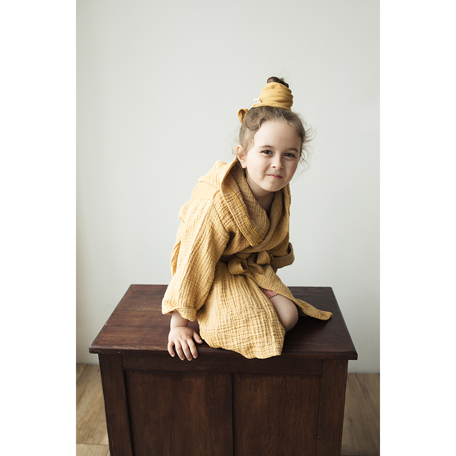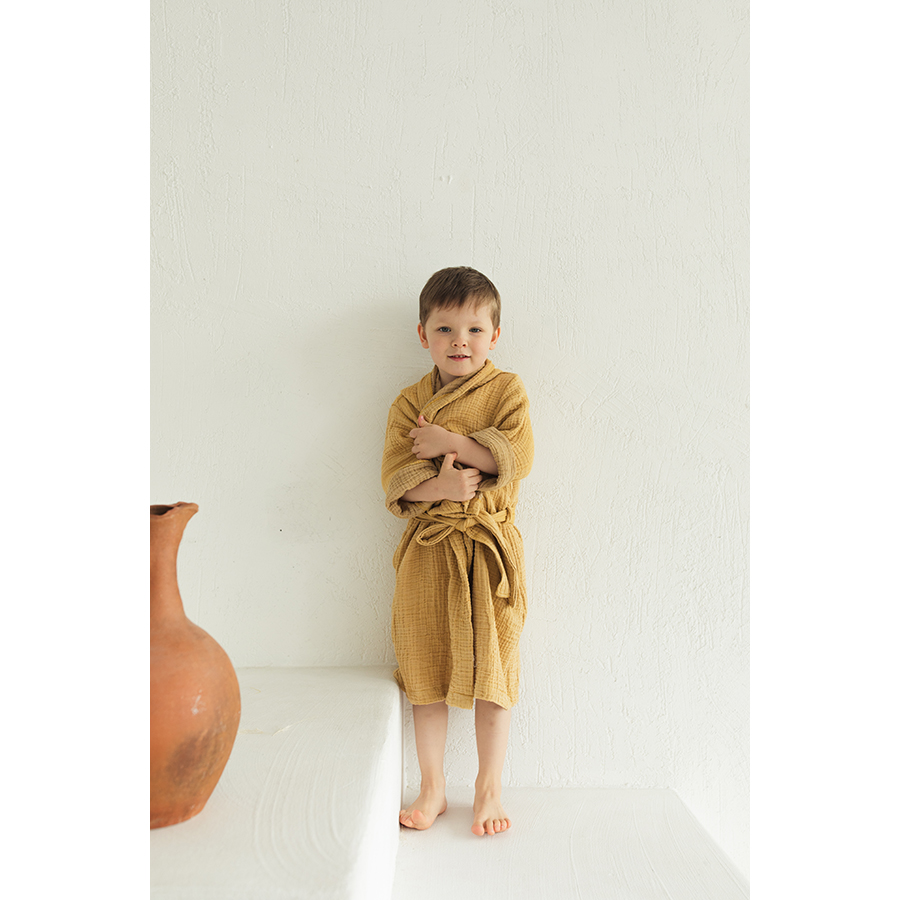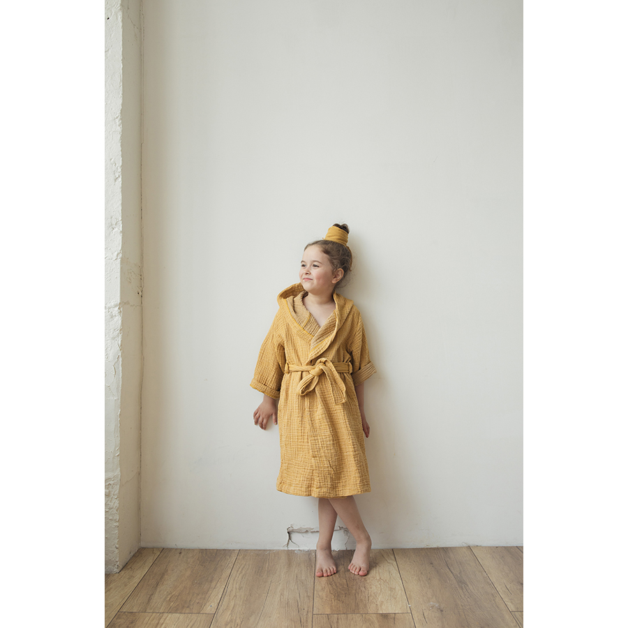 "Халат из жатого хлопка горчичного цвета из коллекции Essential лаконичного дизайна и нейтральной расцветки подойдет и мальчику, и девочке. Изделие с капюшоном и с удобным запахом фиксируется на талии широким поясом. , ,
