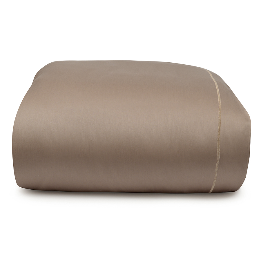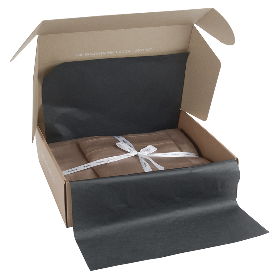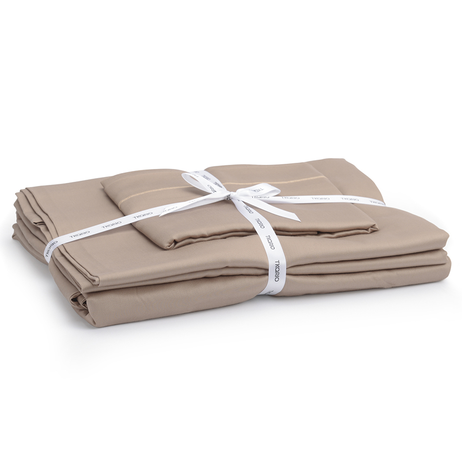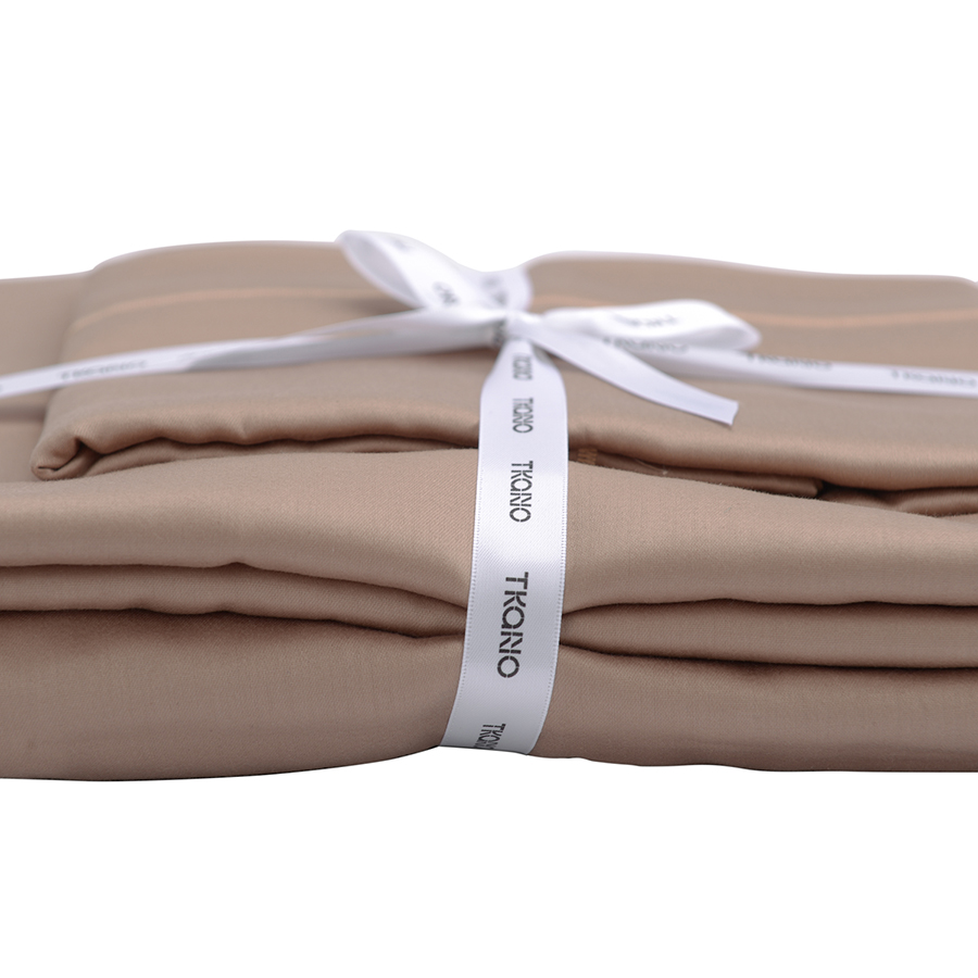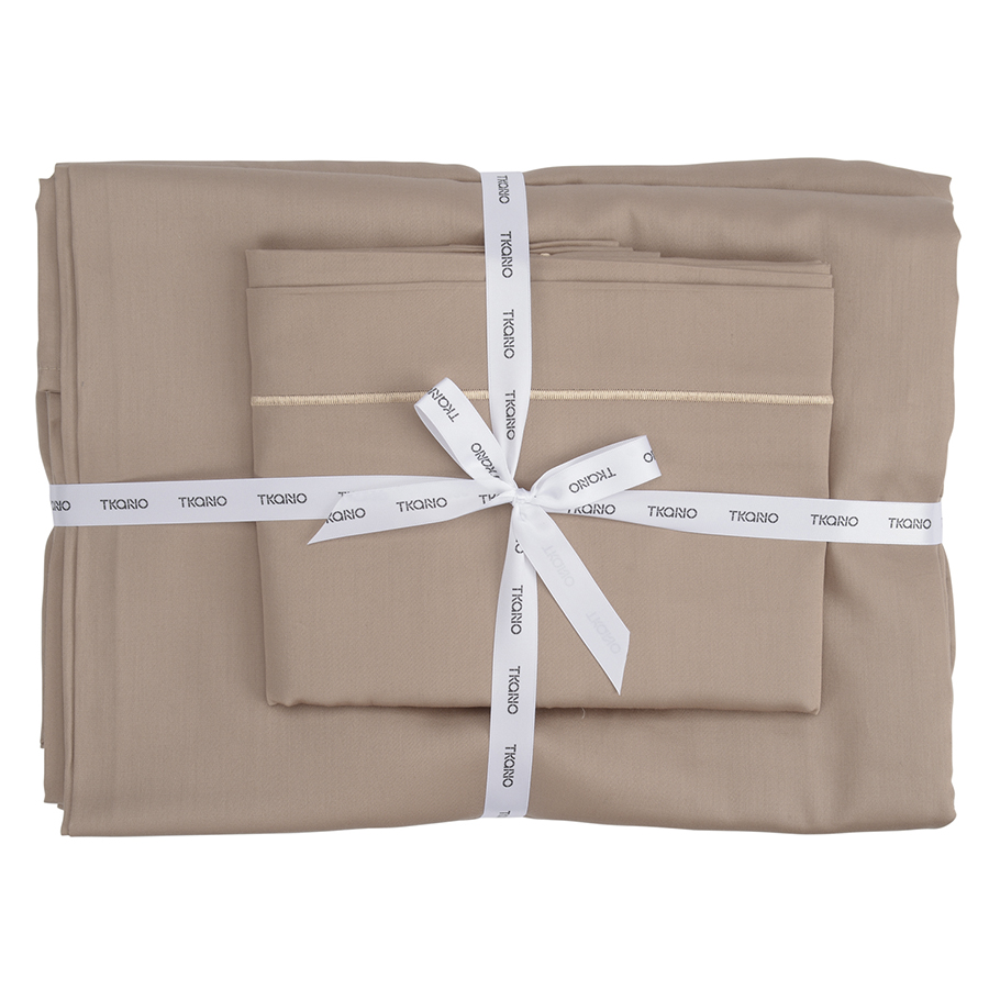 "Универсальный комплект постельного белья из сатина плотностью в 300ТС в бежевом оттенке. Полноценный набор из чистого египетского хлопка включает в себя наволочки, пододеяльник и простынь. Изделия можно комплектовать с другими моделями из коллекции или презентовать в качестве подарка: набор уже упакован в стильный крафтовый бокс.