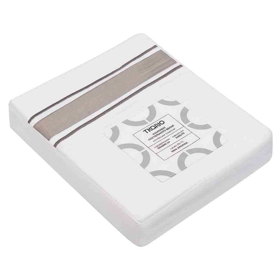"Комплект постельного белья из сатина белого цвета с серым кантом из коллекции Essential станет акцентом в интерьере спальни. Хлопковый сатин плотностью 210 ТС приятен на ощупь и обладает естественным блеском. Он не теряет внешний вид после множества стирок, не деформируется и не линяет, на нем не образуются катышки.