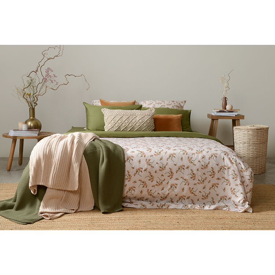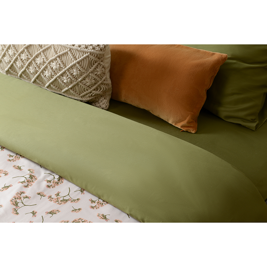 "Комплект постельного белья из сатина оливкового цвета с растительным принтом ",Степное цветение", из коллекции Prairie - прекрасный выбор для любителей классических природных мотивов. Двухсторонний пододеяльник позволяет создавать разные комбинации, спокойный цветочный орнамент или глубокий оливковый - выбор за вами. Хлопковый сатин плотностью 210 ТС приятен на ощупь и обладает естественным блеском. Он не теряет внешний вид даже после множества стирок, не деформируется и не линяет, на нем не образуются катышки.