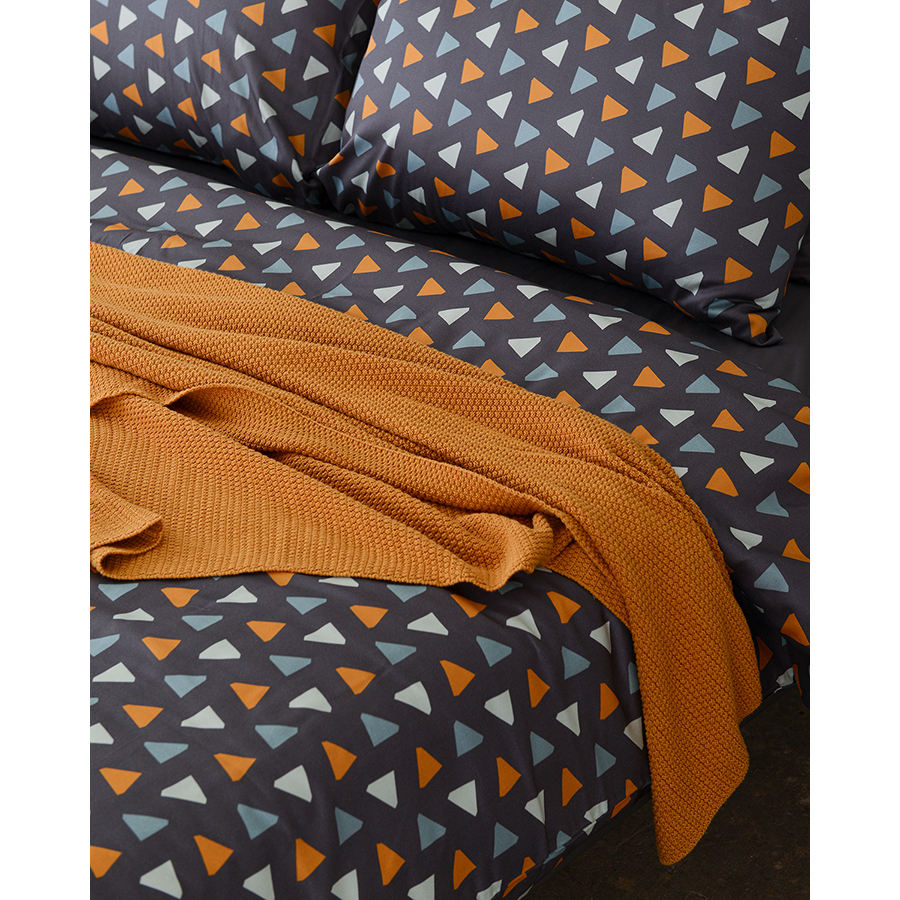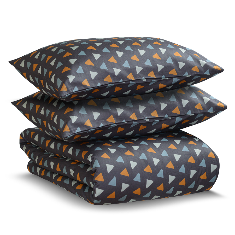 "Комплект постельного белья из сатина с принтом Triangles из коллекции Wild - отличный выбор для любителей простых геометрических решений в дизайне. Разбавив его наволочками и простыней шафранового оттенка, темно-серого или мятного цветов, вы получите готовое дизайнерское решение для вашей спальни. Хлопковый сатин плотностью 210 ТС приятен на ощупь и обладает естественным блеском. Он не теряет внешний вид даже после множества стирок, не деформируется и не линяет, на нем не образуются катышки.