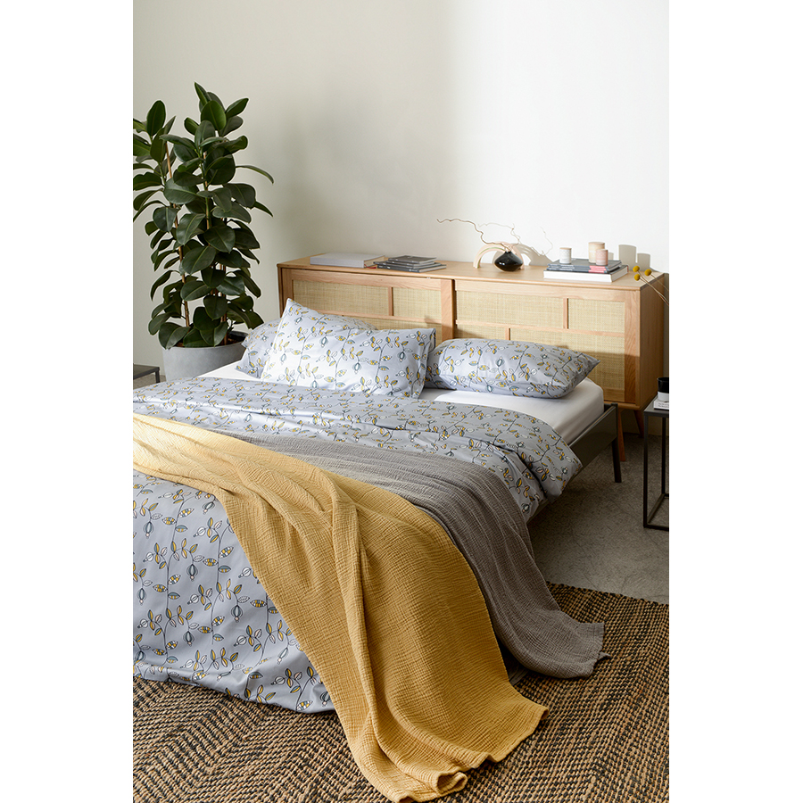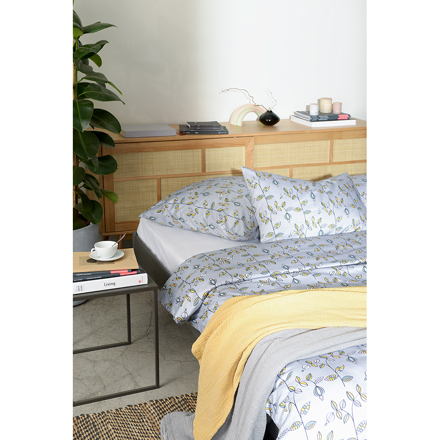 В комплекте: пододеяльник 200х220 см, застегивающийся на пуговицы, и две наволочки 50х70 см с системой закрытия клапан.