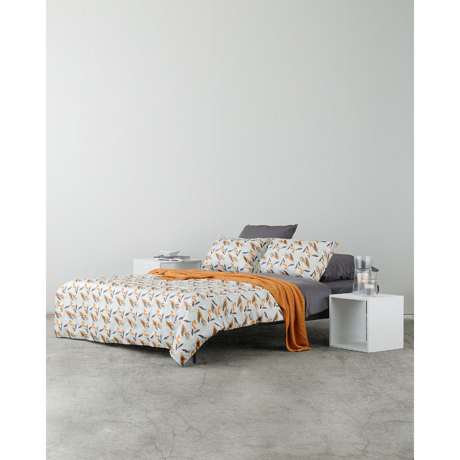 В комплекте: пододеяльник 150х200 см, застегивающийся на пуговицы, и две наволочки 50х70 см с системой закрытия клапан.