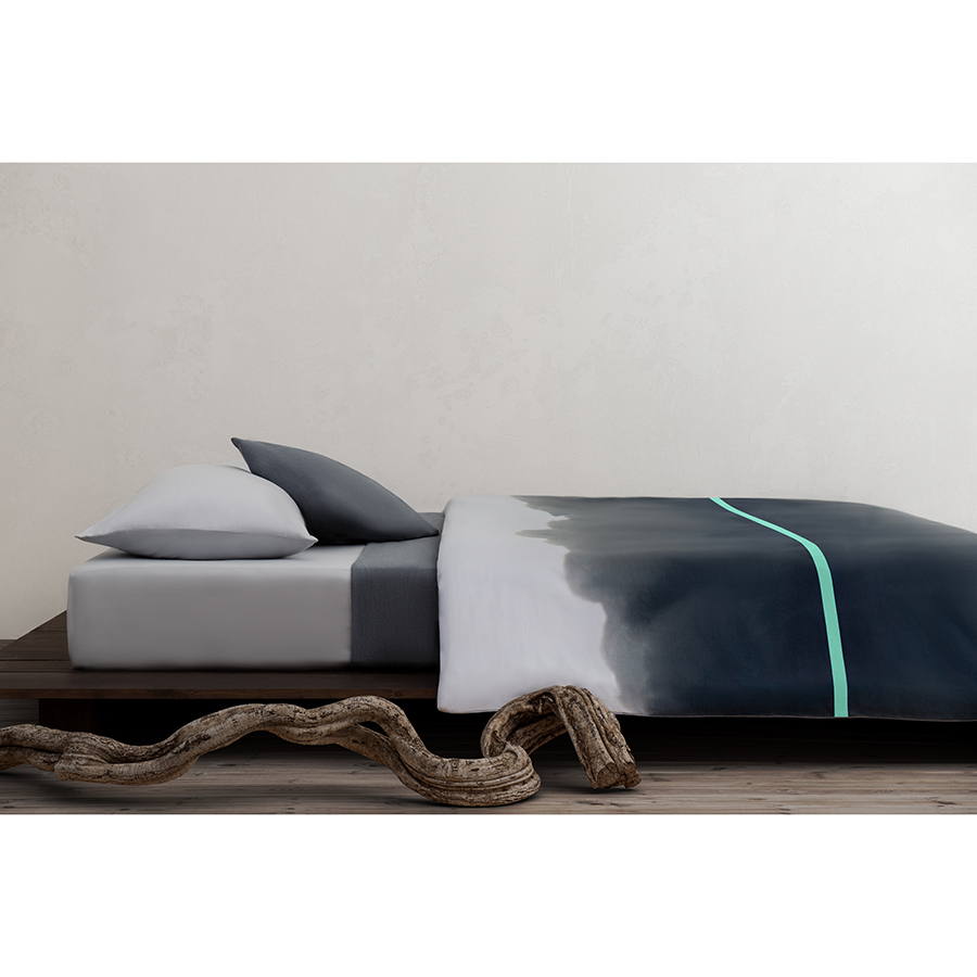 "Комплект постельного белья из умягченного сатина из коллекции Slow Motion, Mint с авторским принтом, напоминающим игру света и теней в пространстве по-настоящему освежит интерьер спальни. Симметрия, плавные волны и яркая линия на пододеяльнике создают ощущение умиротворения. Умягченный хлопковый сатин плотностью 300 ТС очень похож на шелк. Он мягкий на ощупь, не теряет внешний вид после множества стирок, не линяет и на нем не образуются катышки. Подходит для повседневного использования. Линейка Slow Motion - вторая коллаборация с предметным дизайнером Димой Логиновым.