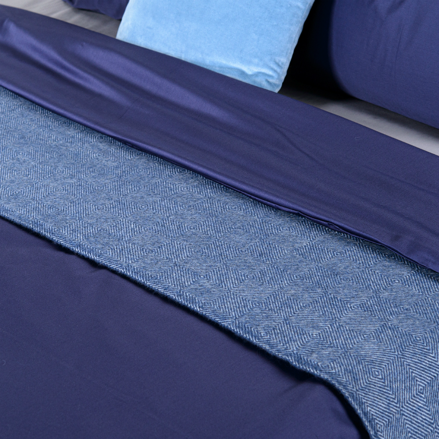 "Пододеяльник и две наволочки 50х70 выполнены из плотного хлопкового сатина. Приятный на ощупь материал хорошо плотностью 210ТС пропускает воздух, обеспечивая коже комфорт в течение сна. Однотонный комплект представлен в насыщенном синем оттенке.