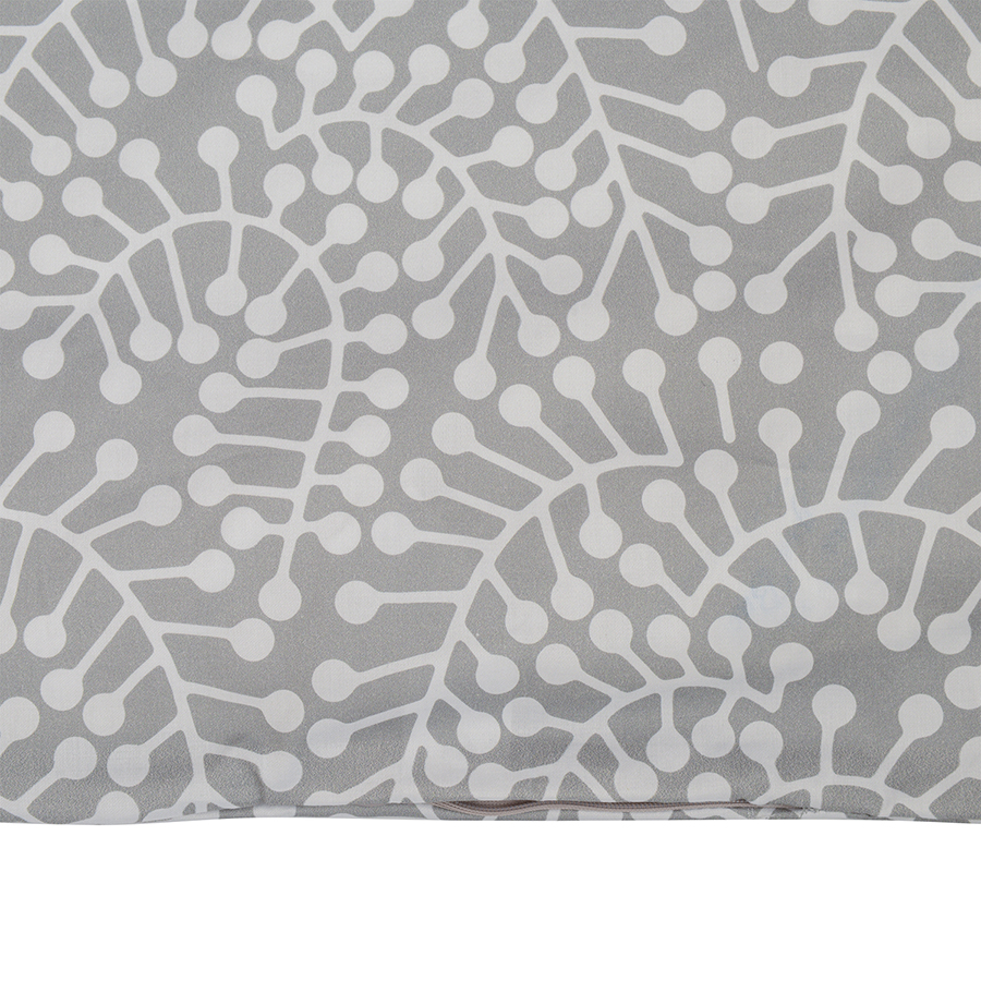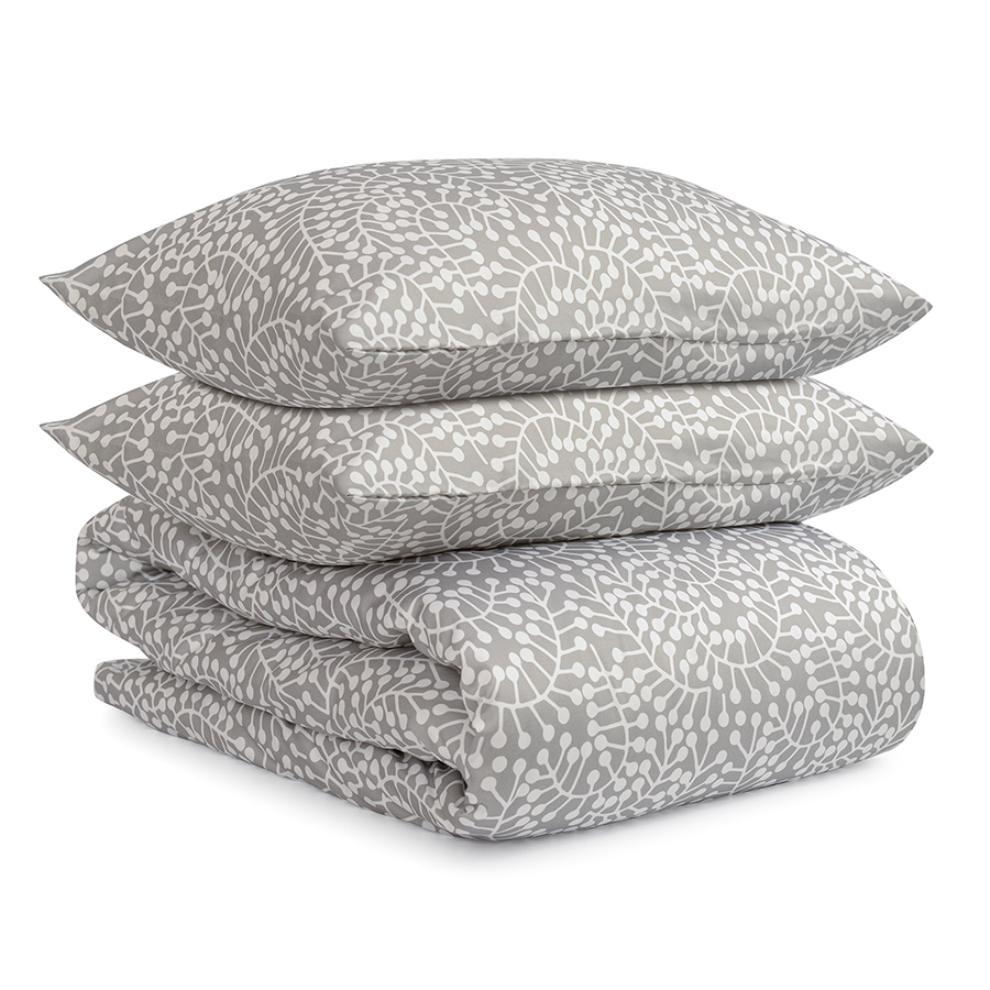 "Комплект постельного белья серого цвета с принтом Спелая смородина из коллекции Scandinavian touch станет ярким акцентом в интерьере спальни. Принт со стилизованными ягодами смородины и округлыми линиями веточек, разработанный одним из ведущих финских дизайнерских агентств, гармонично впишется в любой современный интерьер. Сатин плотностью 210 ТС приятен на ощупь, обладает естественным блеском и не теряет внешний вид даже после множества стирок.