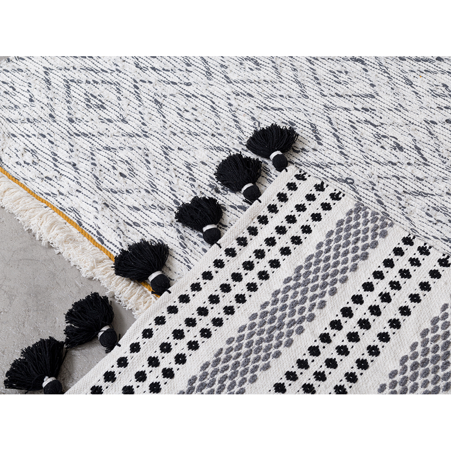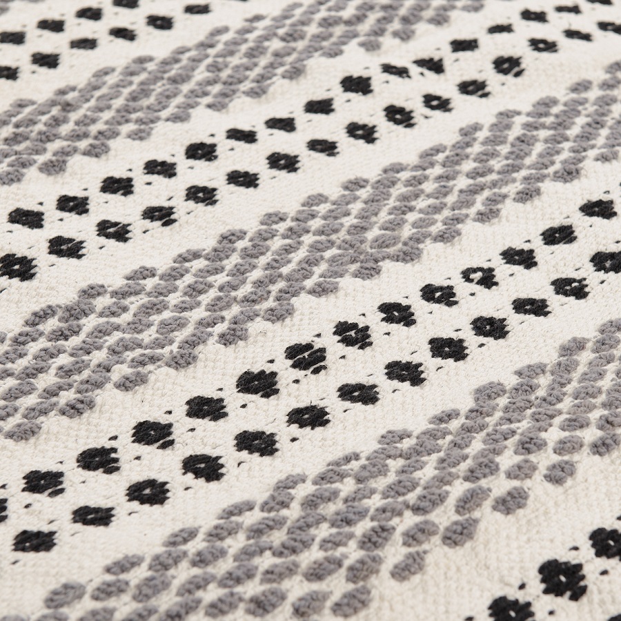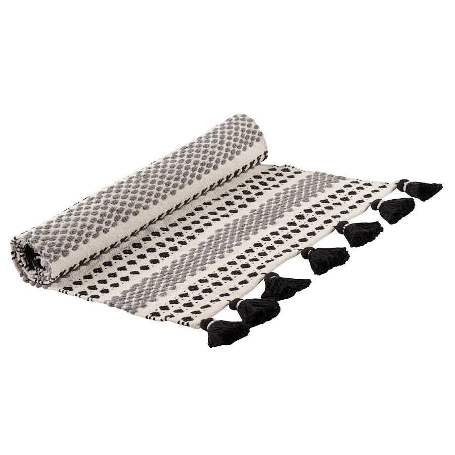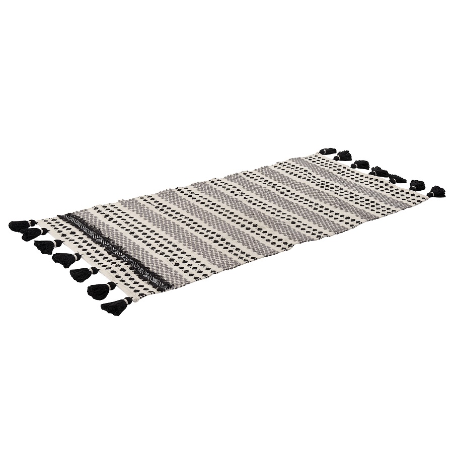 "Ковер из хлопка Chennai из коллекции Ethnic декорирован контрастным линейным орнаментом черно-белого цвета и пышными кисточками с двух сторон. Он добавит уюта и станет акцентом в любом интерьере, от минимализма и сканди до бохо и фьюжн. Практичная модель из хлопка будет особенно уместна на полу в гостиной или в спальне. Ковер представлен в нескольких размерах.