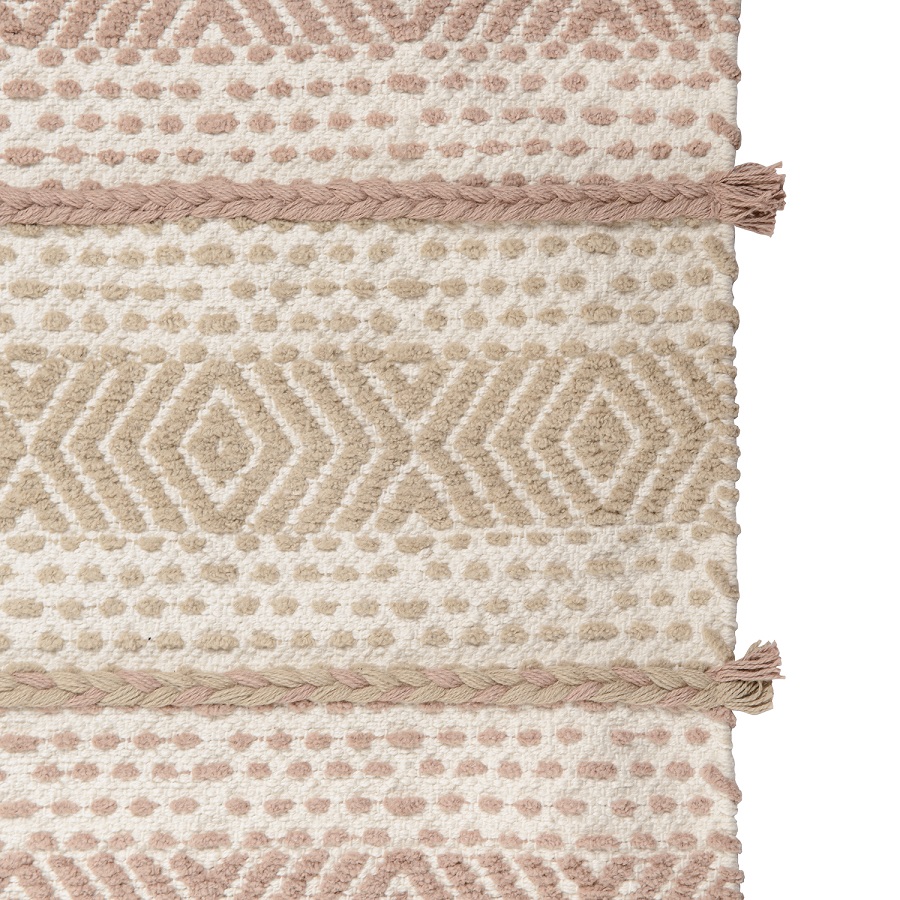 "Ковер из хлопка Kerala из коллекции Ethnic украшен , ,линейным геометрическим принтом в бежевых тонах и пышными кисточками по углам. Он органично впишется в скандинавский стиль, минимализм или бохо. Изделие выполнено из прочного высококачественного хлопка. Ковер представлен в нескольких размерах.