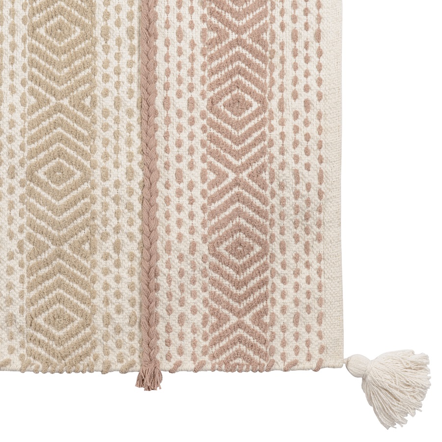 "Ковер из хлопка Kerala из коллекции Ethnic украшен , ,линейным геометрическим принтом в бежевых тонах и пышными кисточками по углам. Он органично впишется в скандинавский стиль, минимализм или бохо. Изделие выполнено из прочного высококачественного хлопка. Ковер представлен в нескольких размерах.