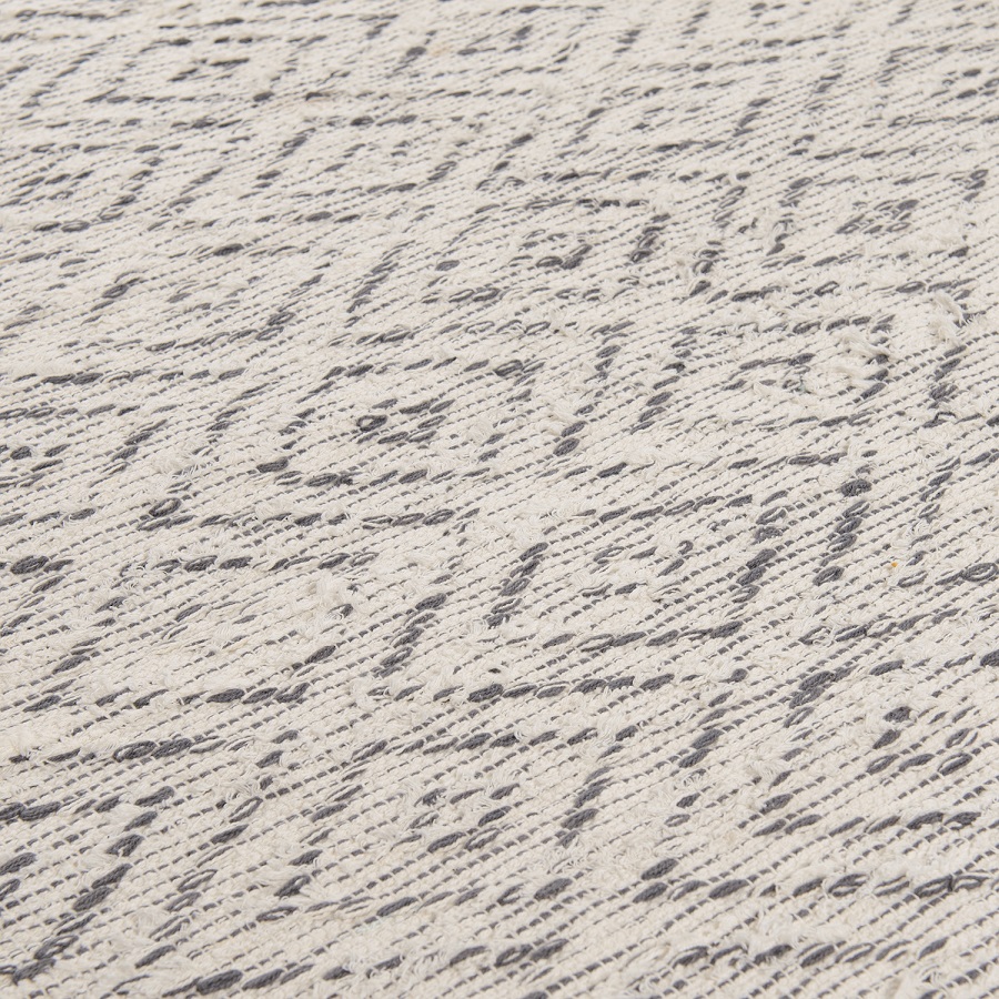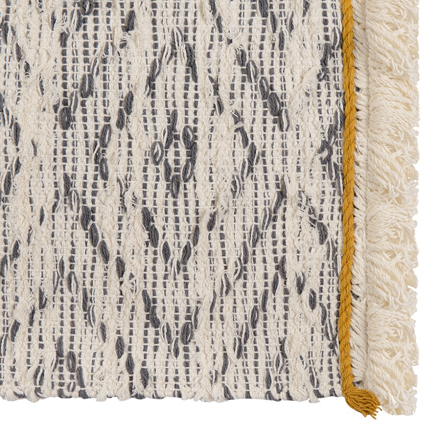 "Ковер из хлопка Pune из коллекции Ethnic с линейным серым орнаментом и бахромой дополнит современный интерьер. Он добавит уюта и станет акцентом в помещениях в стилях минимализм, сканди и бохо. Практичная модель из хлопка будет особенно уместна на полу в гостиной или в спальне. Ковер представлен в нескольких размерах.