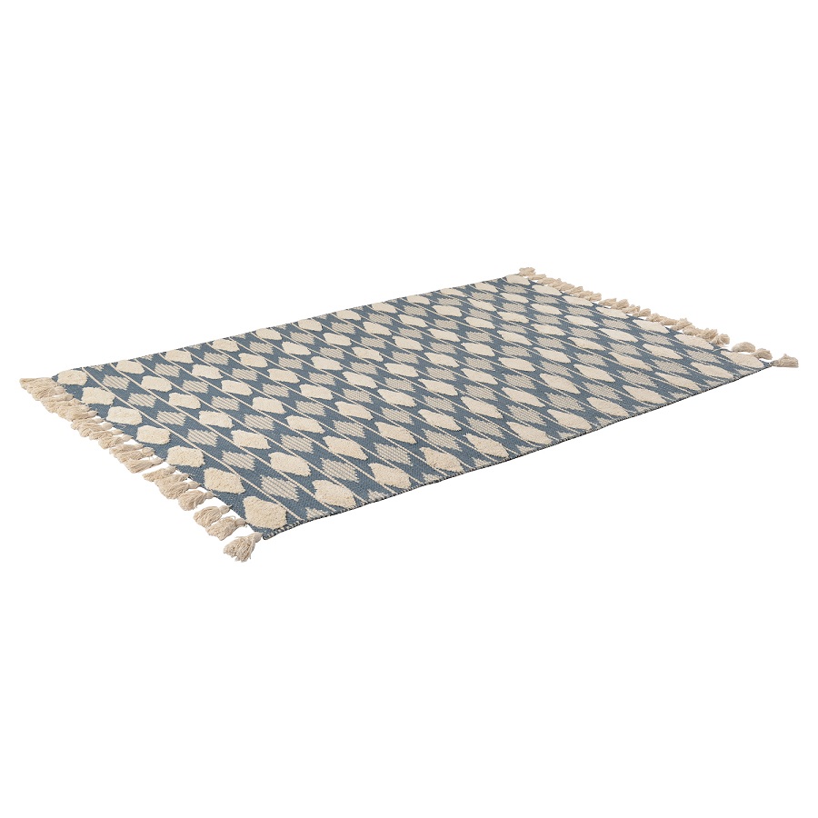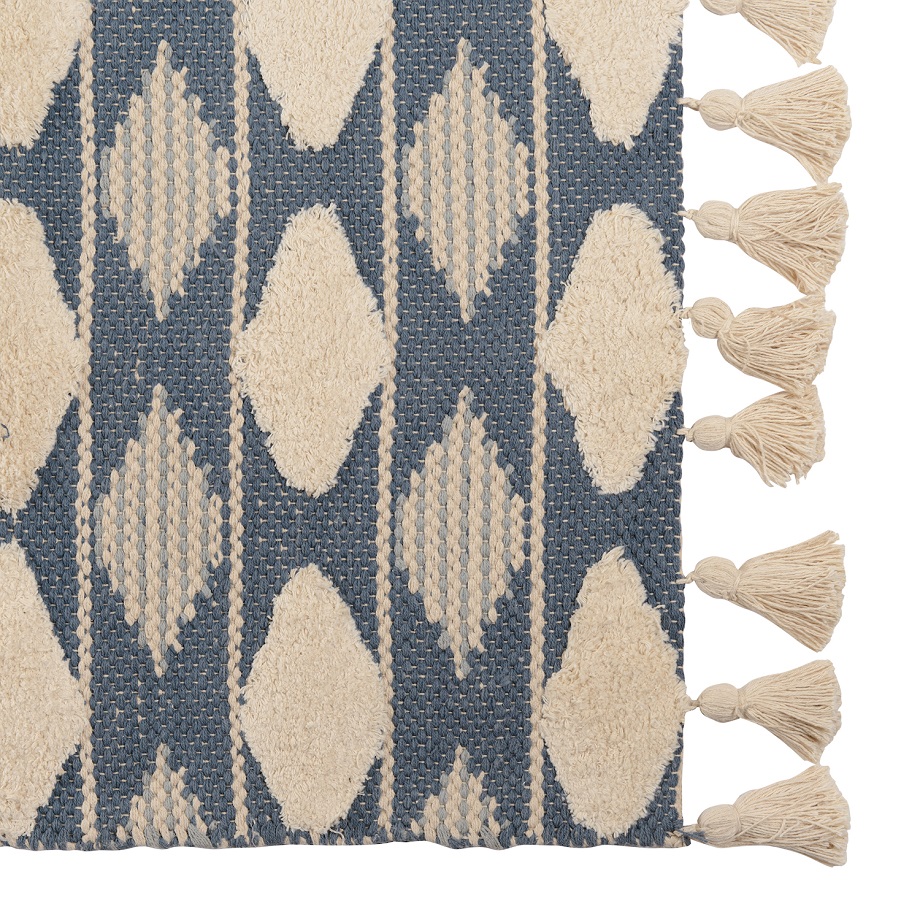 "Ковер из хлопка синего цвета Argyle из коллекции Ethnic украшен контрастным геометрическим принтом и пышными кисточками по бокам. Модель органично впишется в скандинавский стиль или минимализм. Ковер можно повесить на стену в качестве арт-объекта, поместить на пол возле дивана или кровати. Изделие на подкладке, выполнено из прочного высококачественного хлопка, край с изнаночной стороны укреплен киперной лентой, исключающей деформацию. Ковер представлен в нескольких размерах.