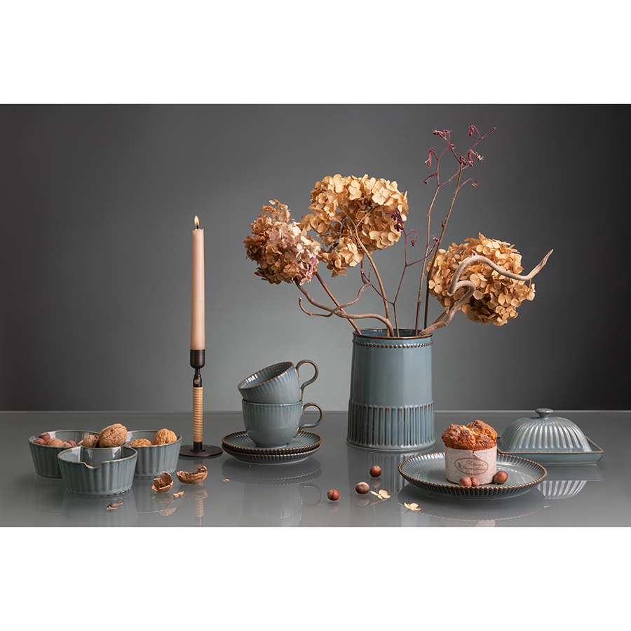 Отличительной особенностью линейки является покрытие из реактивной глазури, которое создает на поверхности посуды уникальные узоры. Во время обжига фарфора возникает химическая реакция, обычно плавление или окисление, в результате которой и получается нужный рисунок. Благодаря такой обработке найти два идентичных изделия практически невозможно. Именно за счет своей индивидуальности и неповторимости узора столовая посуда и аксессуары для сервировки с реактивной глазурью стали трендом в мире дизайна и декора.