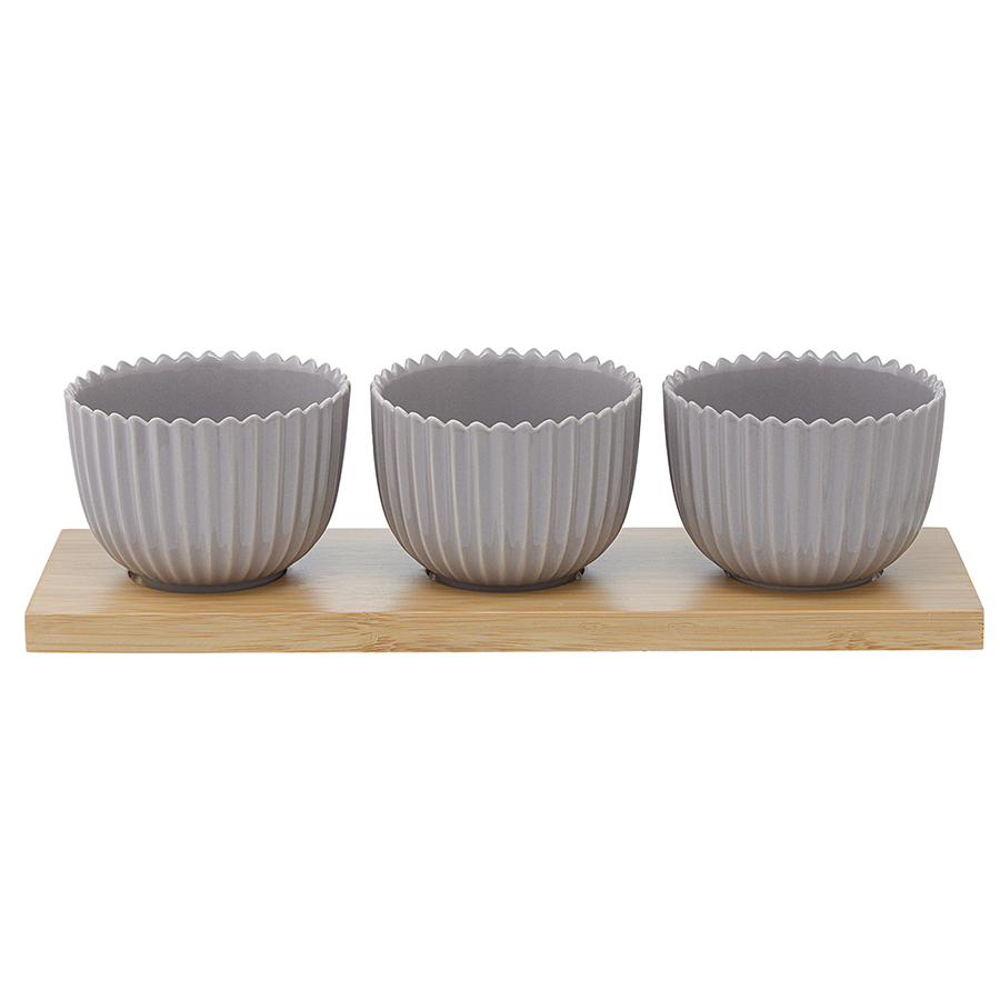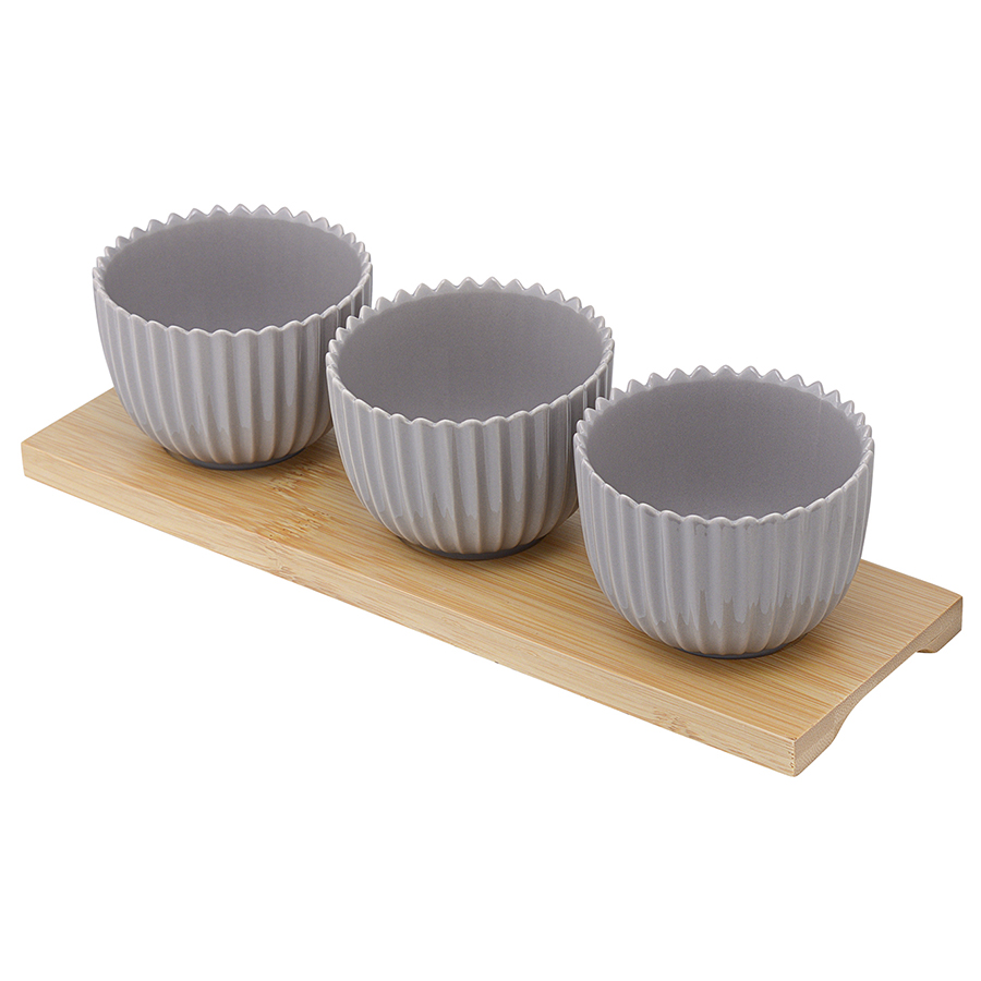 "Набор для сервировки состоит из трех фарфоровых чаш насыщенного темно-серого цвета и подставки из полированного бамбука. Такой набор идеально подойдет для подачи закусок, соусов или сладостей к праздничному столу или семейному ужину. Глянцевая фарфоровая поверхность чаш имеет рифленую фактуру, что добавляет сервировке легкости и утонченности. При этом чаши очень практичны: не царапаются, не меняют цвет и легко моются. Этот набор прекрасно сочетается с другой посудой из коллекции Edge, в которой есть тарелки, чашки, салатники, сахарницы и другие предметы.