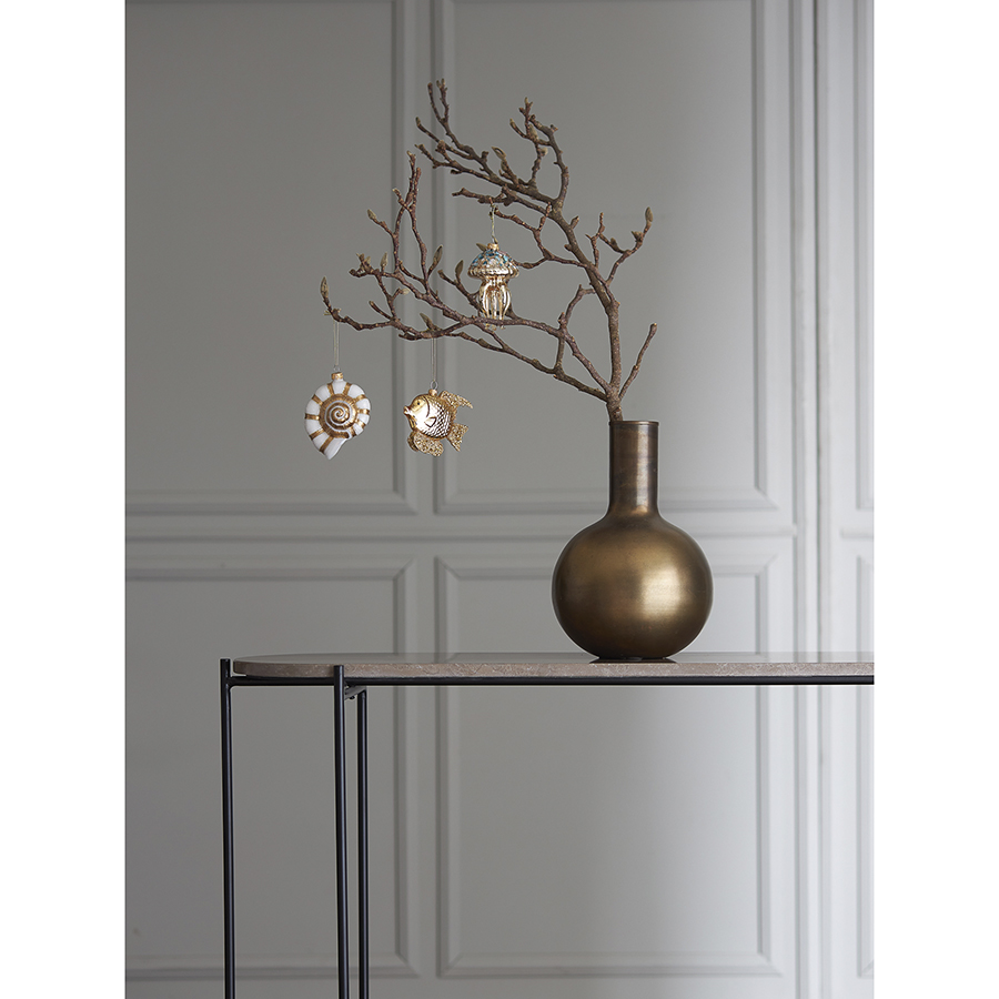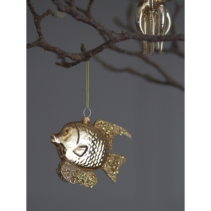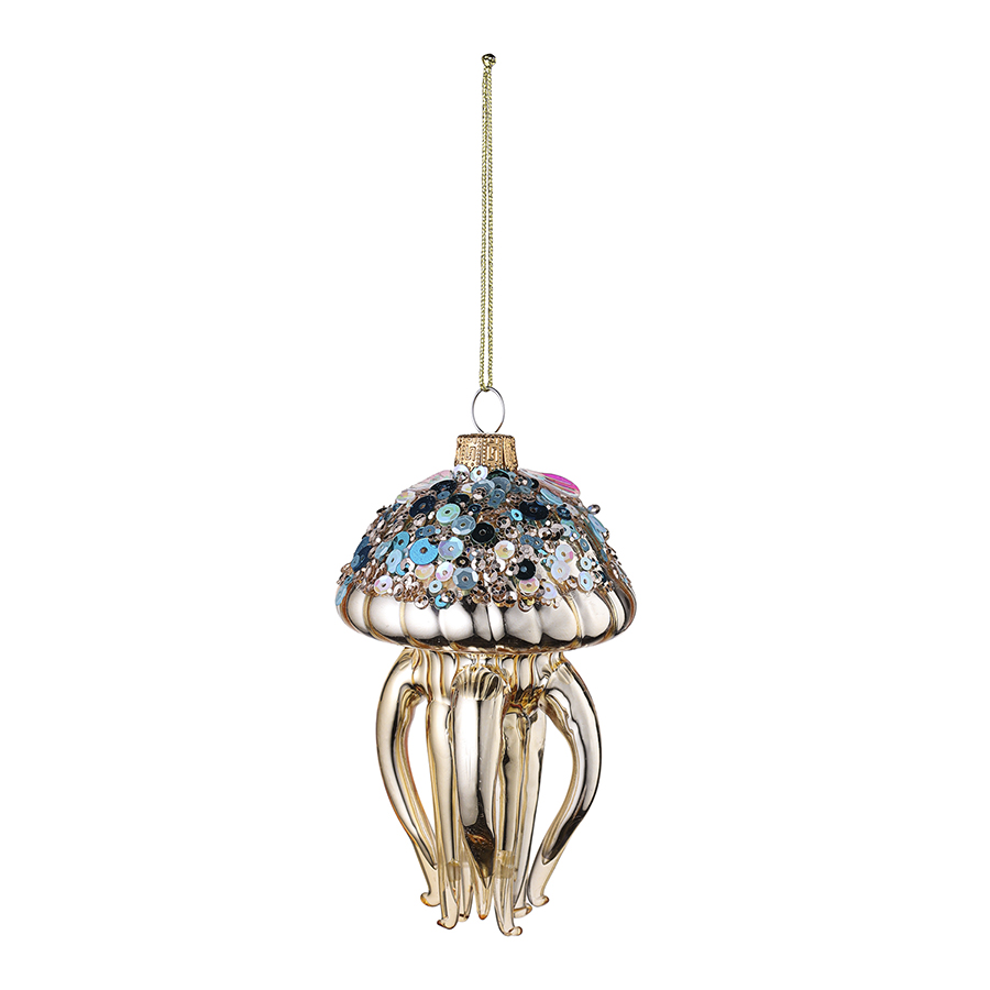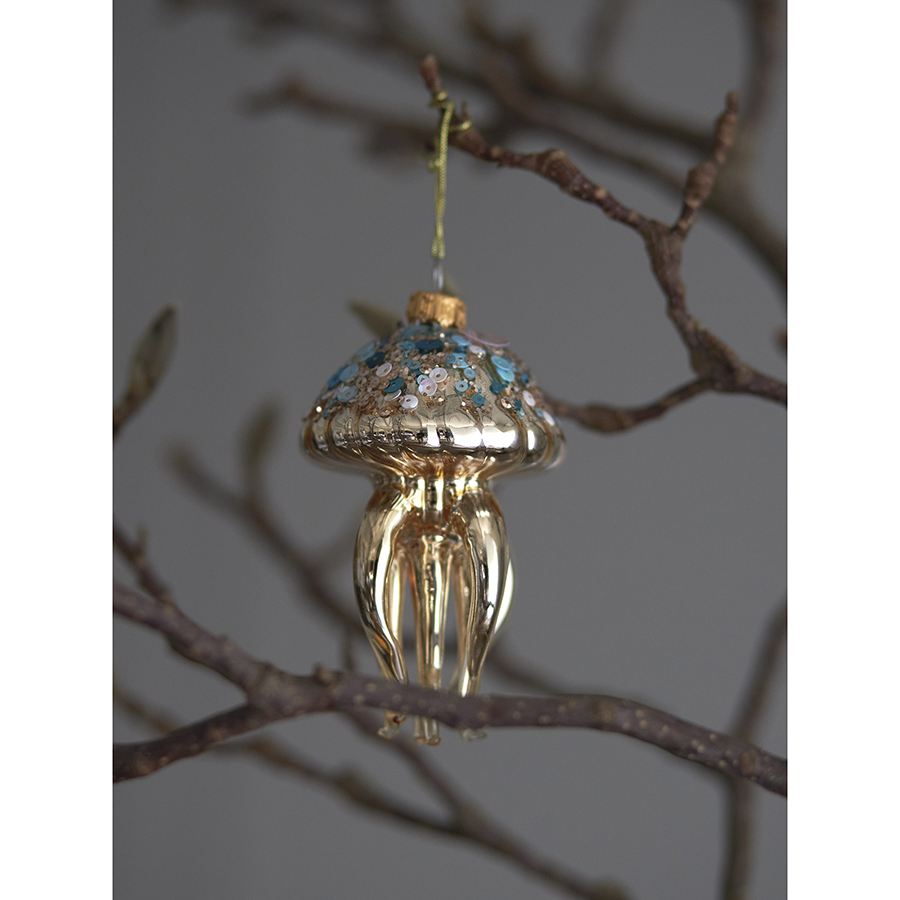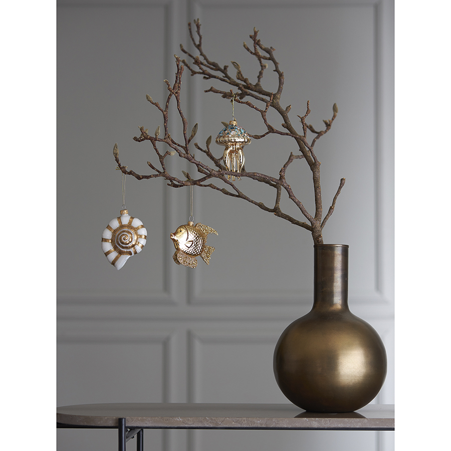 "Набор украшений Sea Life из коллекции New Year Essential позволит погрузиться в завораживающий мир океанских глубин. Золотые рыбки, сияющие медузы, перламутровые ракушки преобразят вашу ёлку и помогут создать в доме сказочную атмосферу.