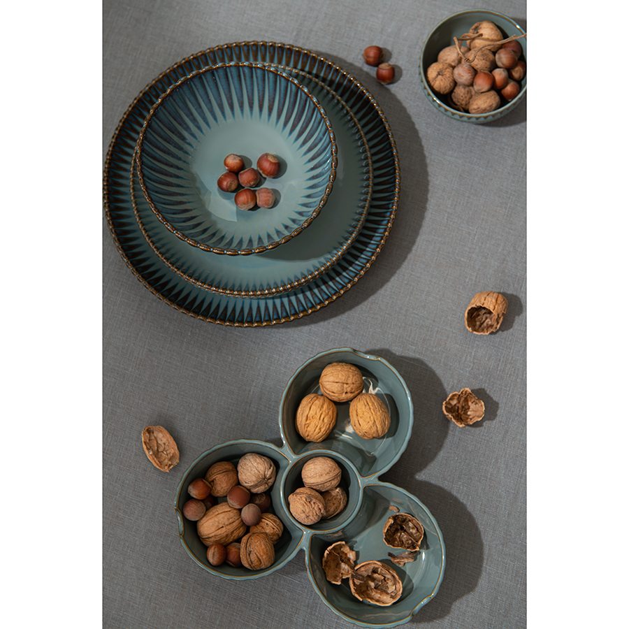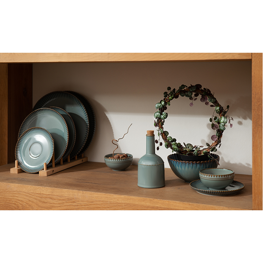 Отличительной особенностью линейки является покрытие из реактивной глазури, которое создает на поверхности посуды уникальные узоры. Во время обжига фарфора возникает химическая реакция, обычно плавление или окисление, в результате которой и получается нужный рисунок. Благодаря такой обработке найти два идентичных изделия практически невозможно. Именно за счет своей индивидуальности и неповторимости узора столовая посуда и аксессуары для сервировки с реактивной глазурью стали трендом в мире дизайна и декора.
