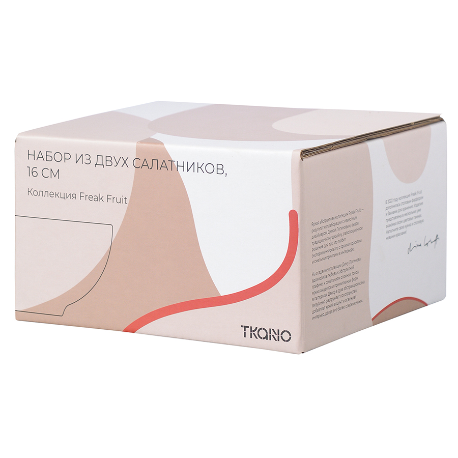 "Набор из двух салатников бежевого цвета с авторским принтом из коллекции Freak Fruit прекрасно подходит для подачи блюд. Оригинальный дизайн в духе абстракционизма сделает теплее атмосферу за столом. Принт на каждом изделии не имеет повторяющегося раппорта и представляет собой единую законченную картину.