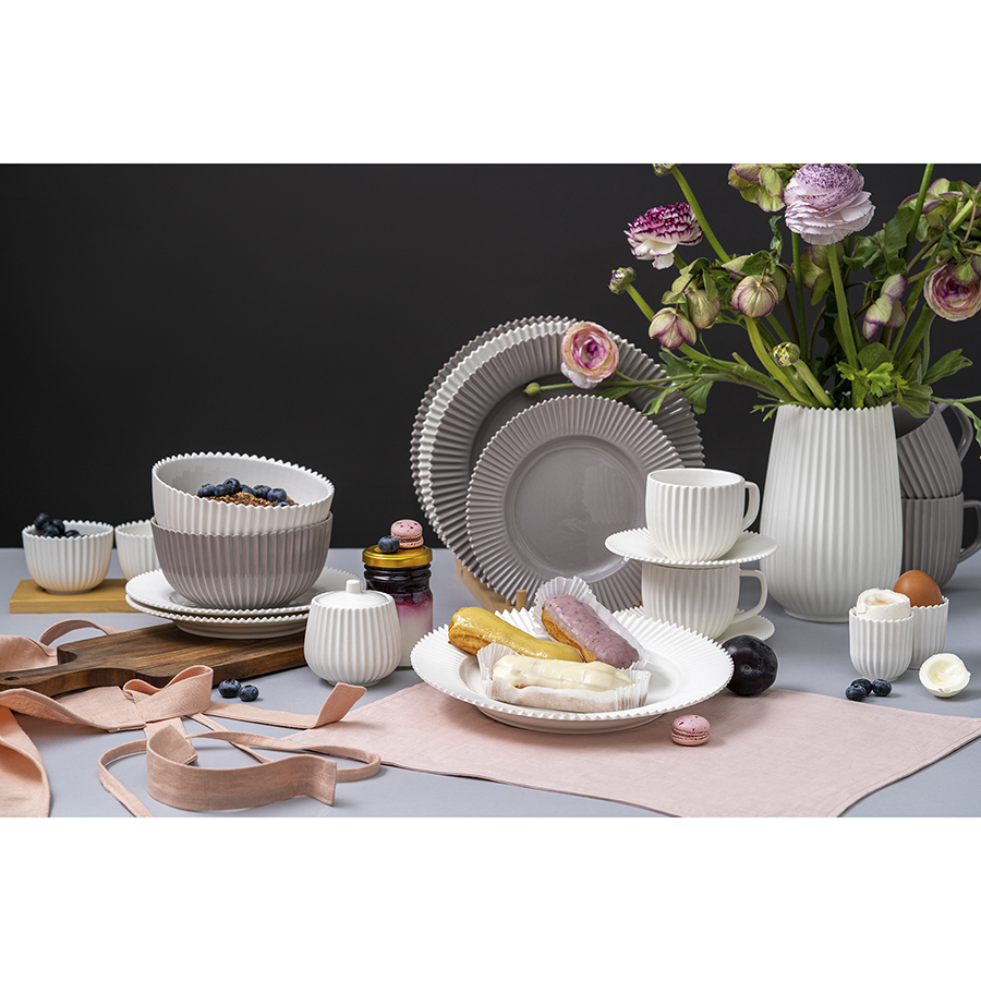 "Набор из двух десертных тарелок белого цвета подойдет как для праздничной сервировки, так и для обычного приема пищи в будний день. Фарфоровые борта тарелок имеют рифленую поверхность и оригинальный зубчатый край, что добавляет дизайну утонченность и изящество. При этом они достаточно прочны, чтобы выдерживать мытье в посудомоечной машине, так что ухаживать за ними будет очень просто. С этими тарелками можно составить целый сервиз, добавив к ним другую посуду из серии Edge — например, чашки и салатники.
