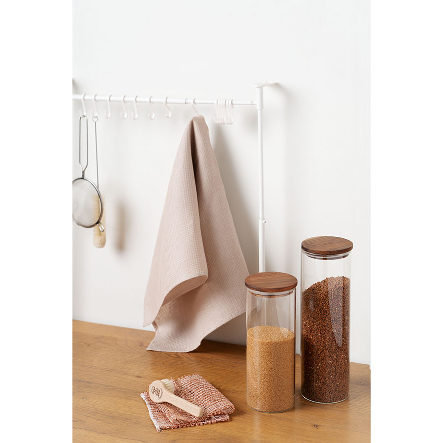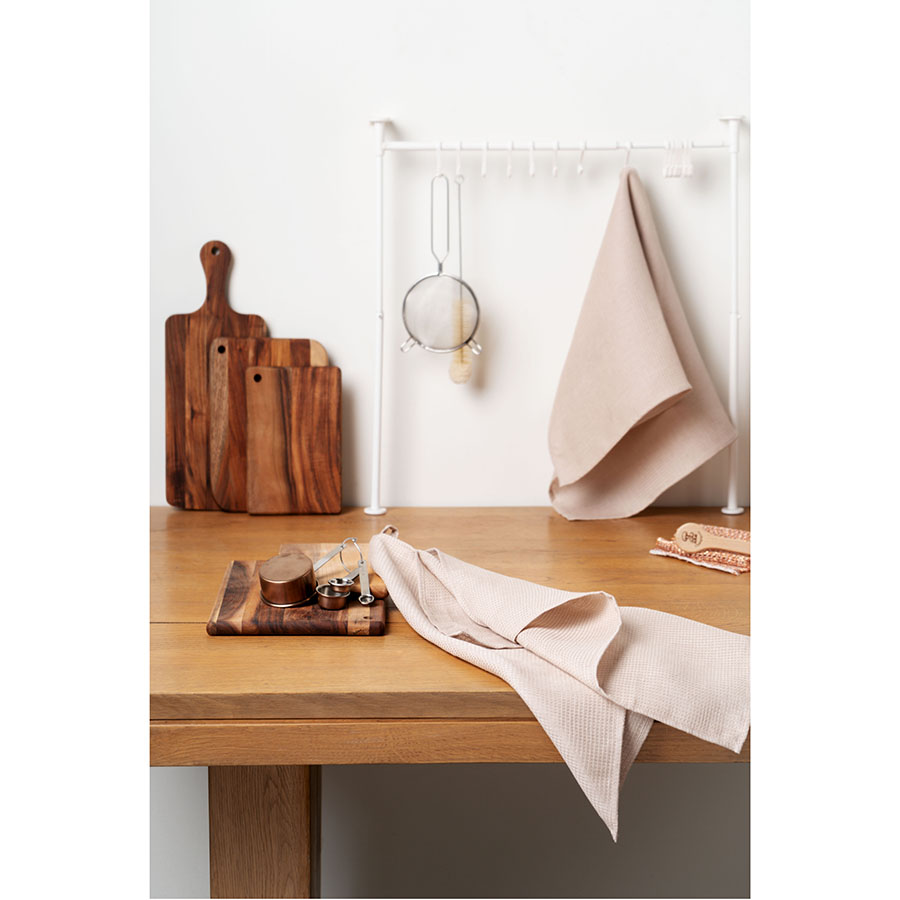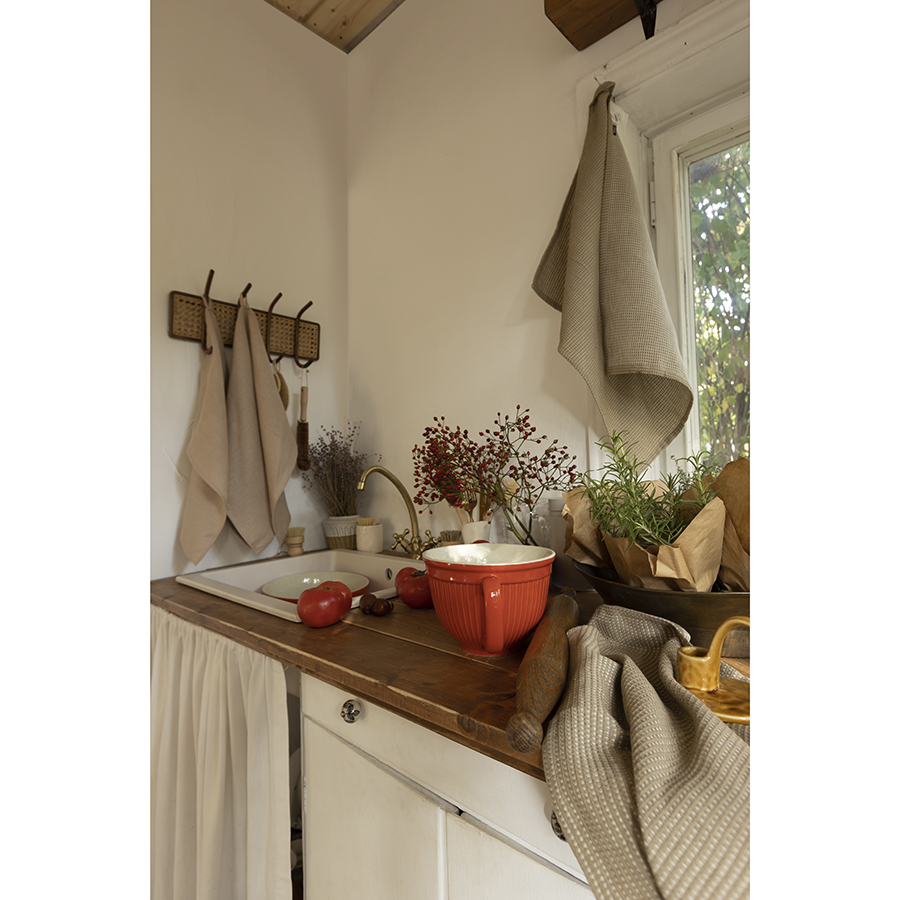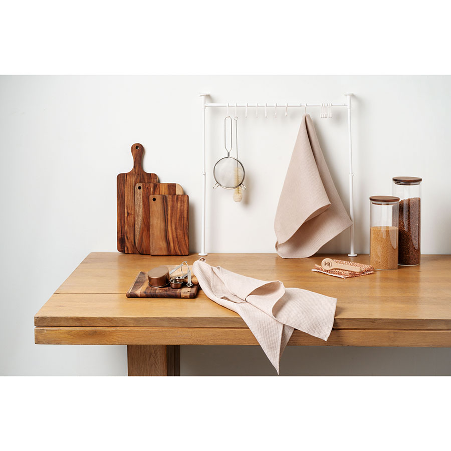 "Набор из двух вафельных полотенец бежевого цвета для кухни из коллекции Essential – отличный вариант для ценителей спокойных природных оттенков. Изделия изготовлены из умягченного льна, который хорошо впитывает влагу и быстро сохнет. Как известно, лен не только прекрасно смотрится в интерьере, но и предотвращает развитие бактерий, что особенно актуально для кухни и столовой. Полотенце можно повесить на крючок, благодаря удобной петельке.