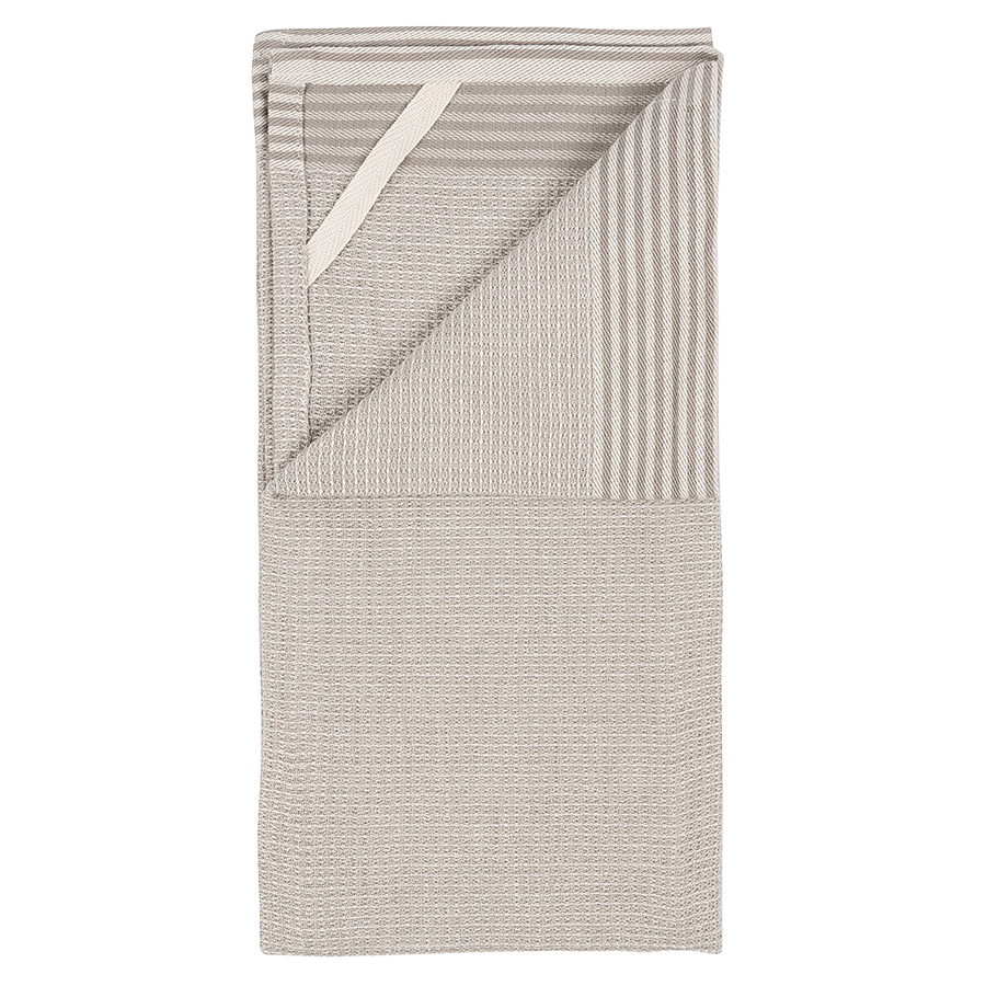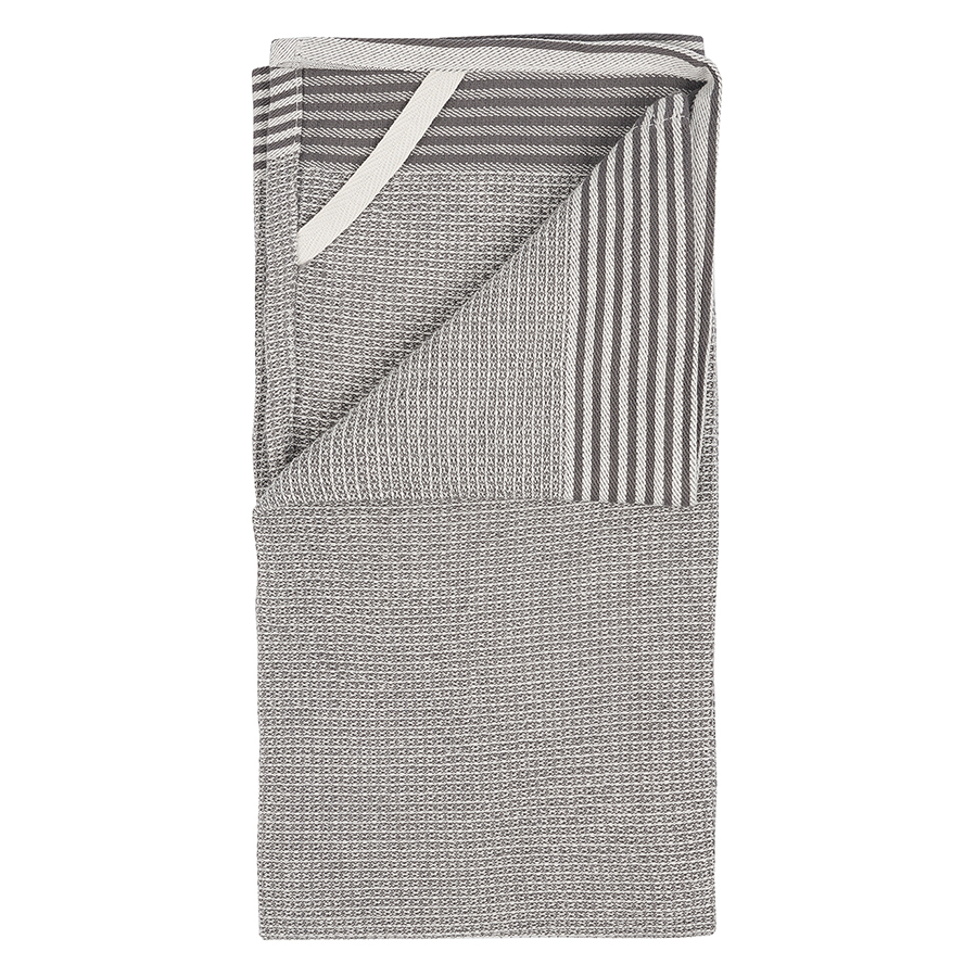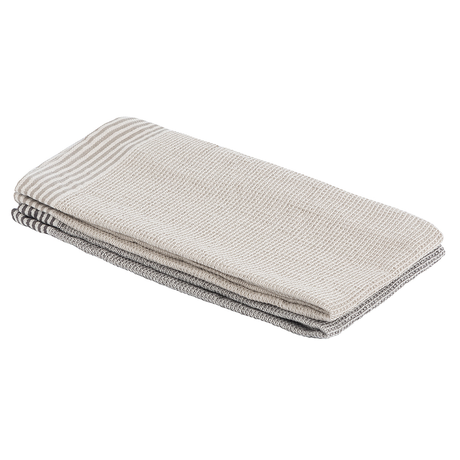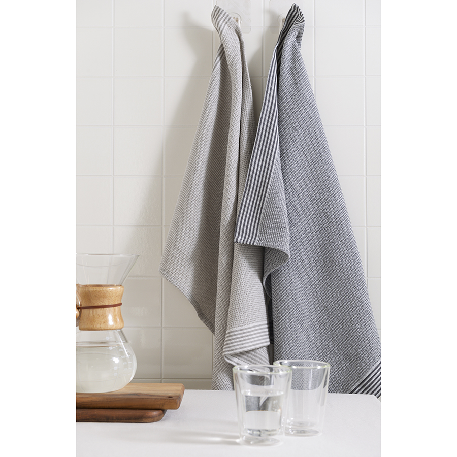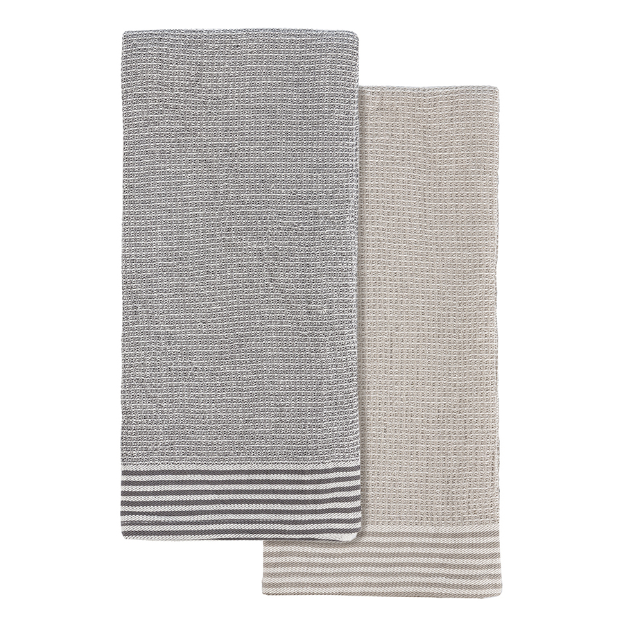 "Набор из двух вафельных полотенец с контрастным кантом из коллекции Essential станет помощником на кухне и настоящим украшением интерьера. Изделия выполнены из 100%, хлопка в двух нейтральных оттенках серого и отделаны стильным полосатым бело-серым кантом по двум сторонам. Полотенца вафельной фактуры прочны и очень практичны — хорошо впитывают влагу и быстро сохнут. Для подвешивания на крючок есть удобная петелька.