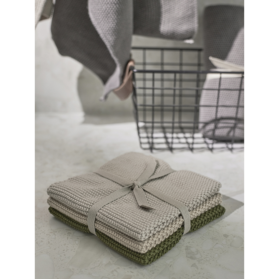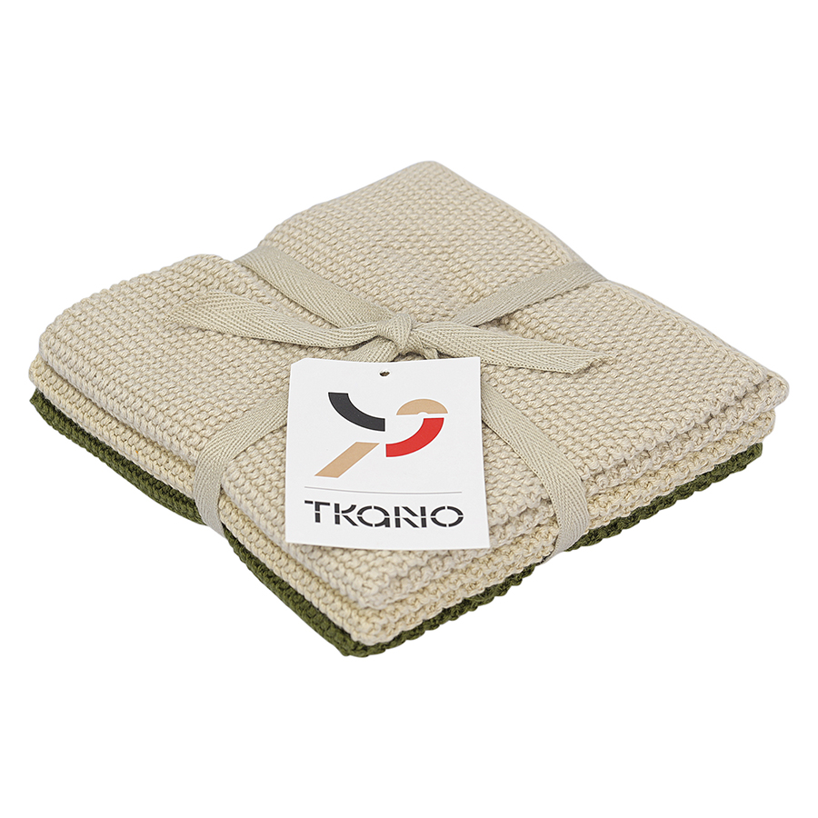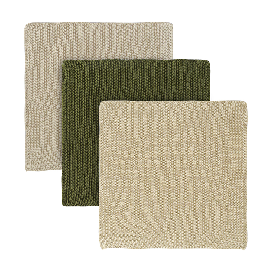 Набор из трех вязаных салфеток для уборки и мытья посуды бежевого и оливкового цветов из коллекции Essential, 28х28 см, Tkano
