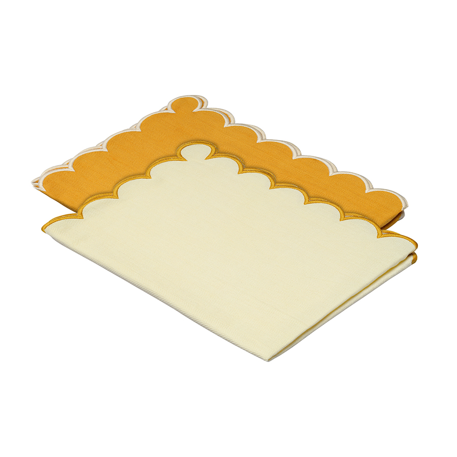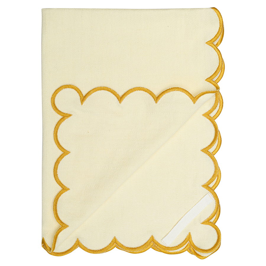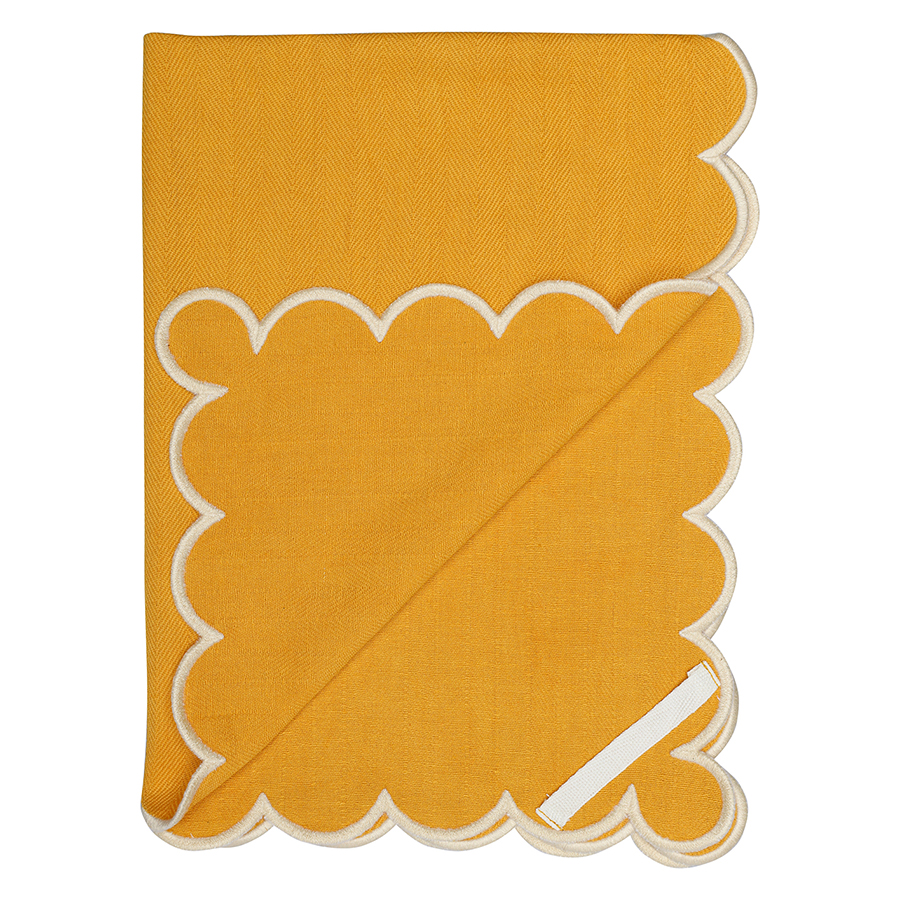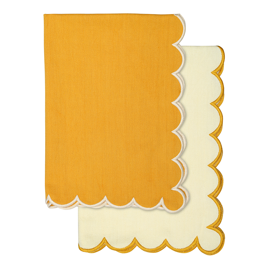 "Набор кухонных полотенец с контрастным кантом горчичного цвета из коллекции Trendy Ruffles идеально подойдет для повседневных задач и в качестве стильного акцента. Текстиль с волнистой отделкой, напоминающей изящные раковины морских гребешков, стал ярким элементом стиля Ар Деко – и сейчас возвращается в моду, появляясь в самых актуальных интерьерных решениях.