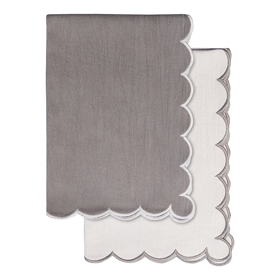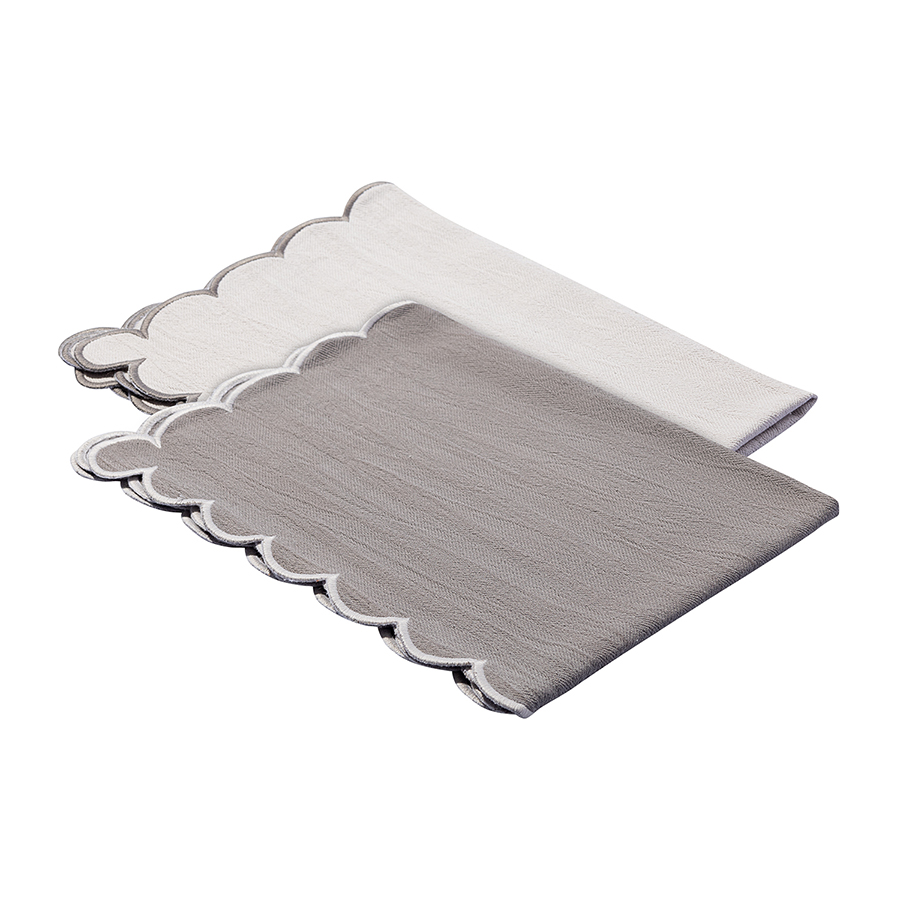 "Набор кухонных полотенец с контрастным кантом серого цвета из коллекции Trendy Ruffles идеально подойдет для повседневных задач и в качестве стильного акцента. Текстиль с волнистой отделкой, напоминающей изящные раковины морских гребешков, стал ярким элементом стиля Ар Деко – и сейчас возвращается в моду, появляясь в самых актуальных интерьерных решениях.