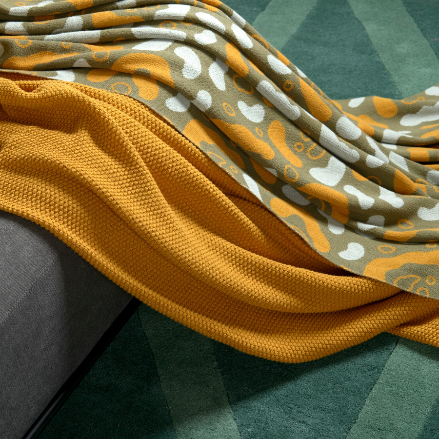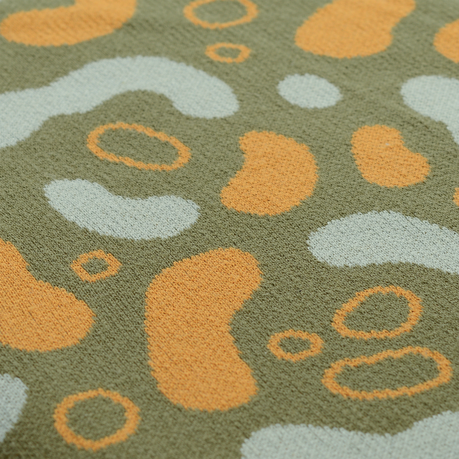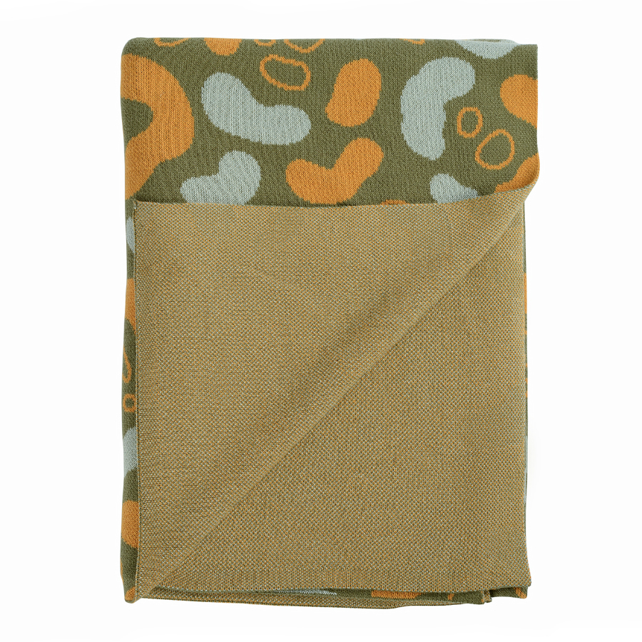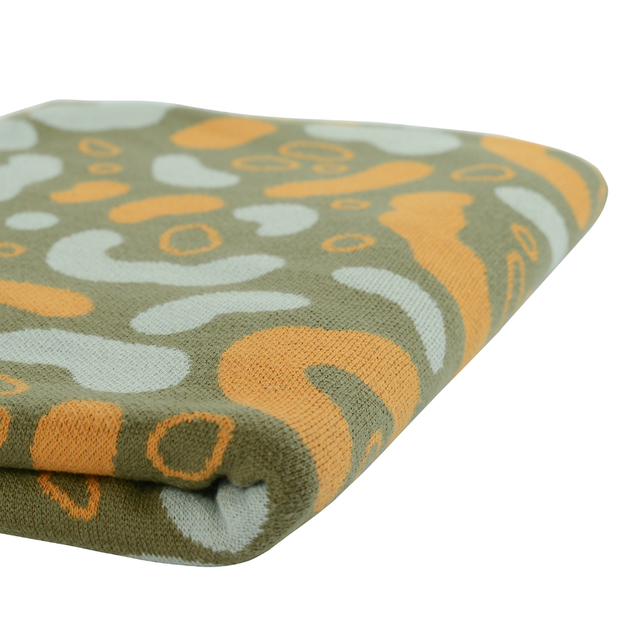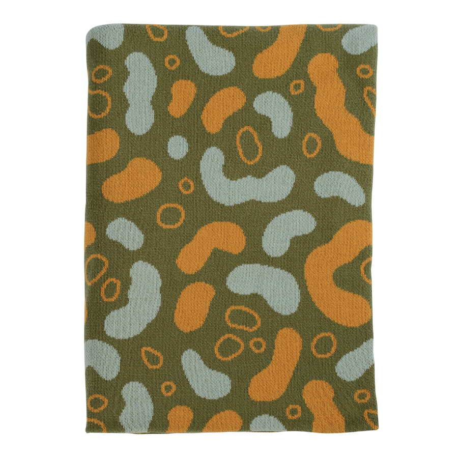 "Вязаный плед оливкового оттенка идеально подчеркнет интерьер: за это отвечает крупный авторский узор Animal spots. Изделие выполнено из прочного мягкого хлопка. Благодаря плотному переплетению гладких нитей такой текстиль не деформируется, не линяет, и на нем не образуются катышки. Плотность ткани - 380GSM. Изделие упаковано в брендированную крафтовую коробку.