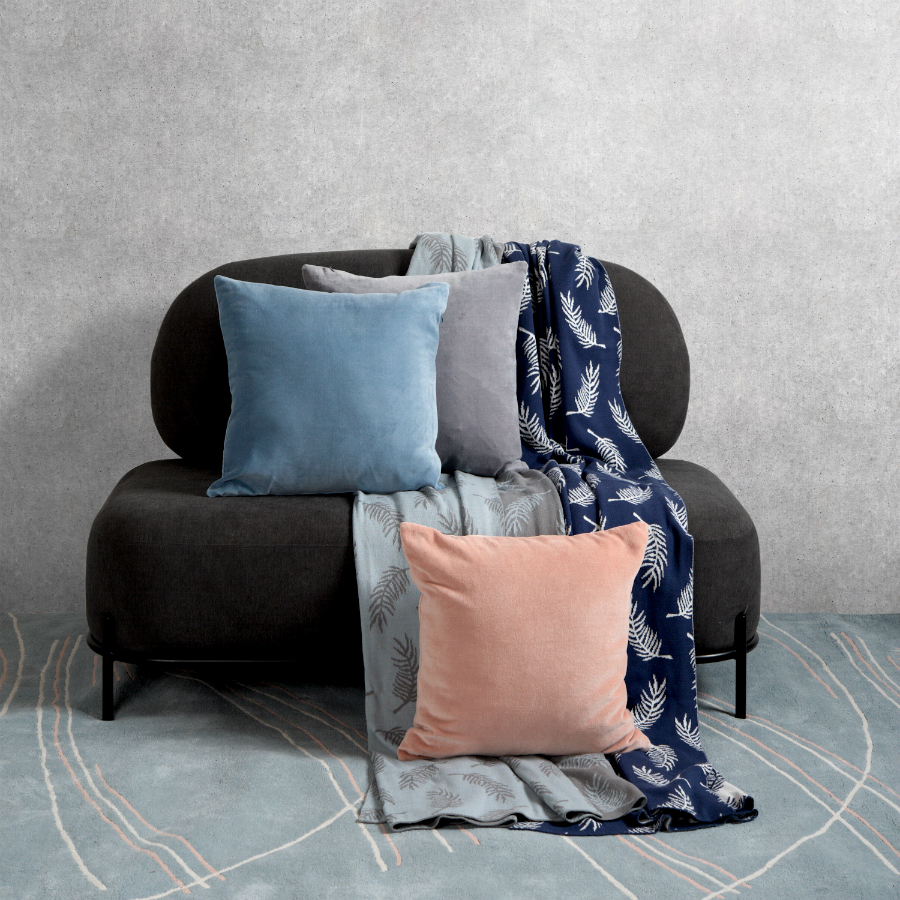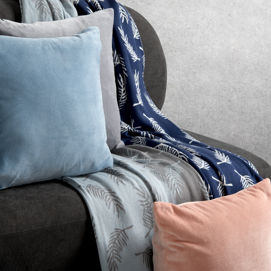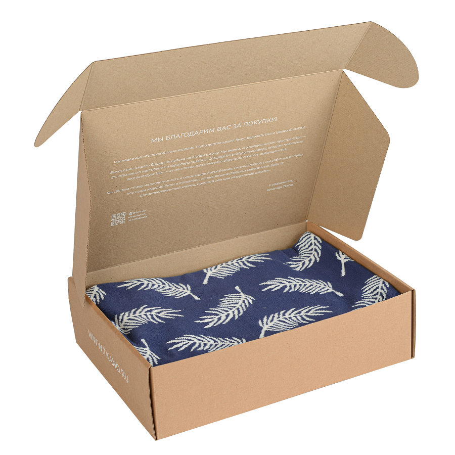 "Вязаный плед синего оттенка идеально подчеркнет интерьер: за это отвечает крупный авторский узор Fleshy Leaves. Изделие выполнено из прочного мягкого хлопка. Благодаря плотному переплетению гладких нитей такой текстиль не деформируется, не линяет, и на нем не образуются катышки. Плотность ткани - 380GSM. Изделие упаковано в брендированную крафтовую коробку.