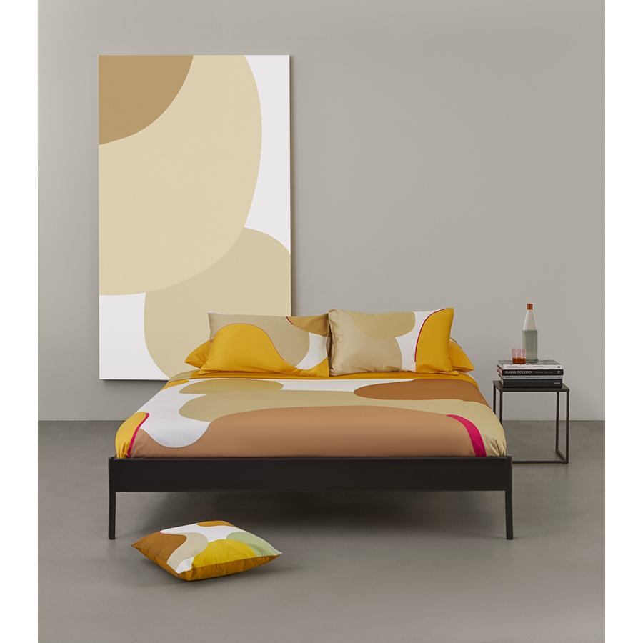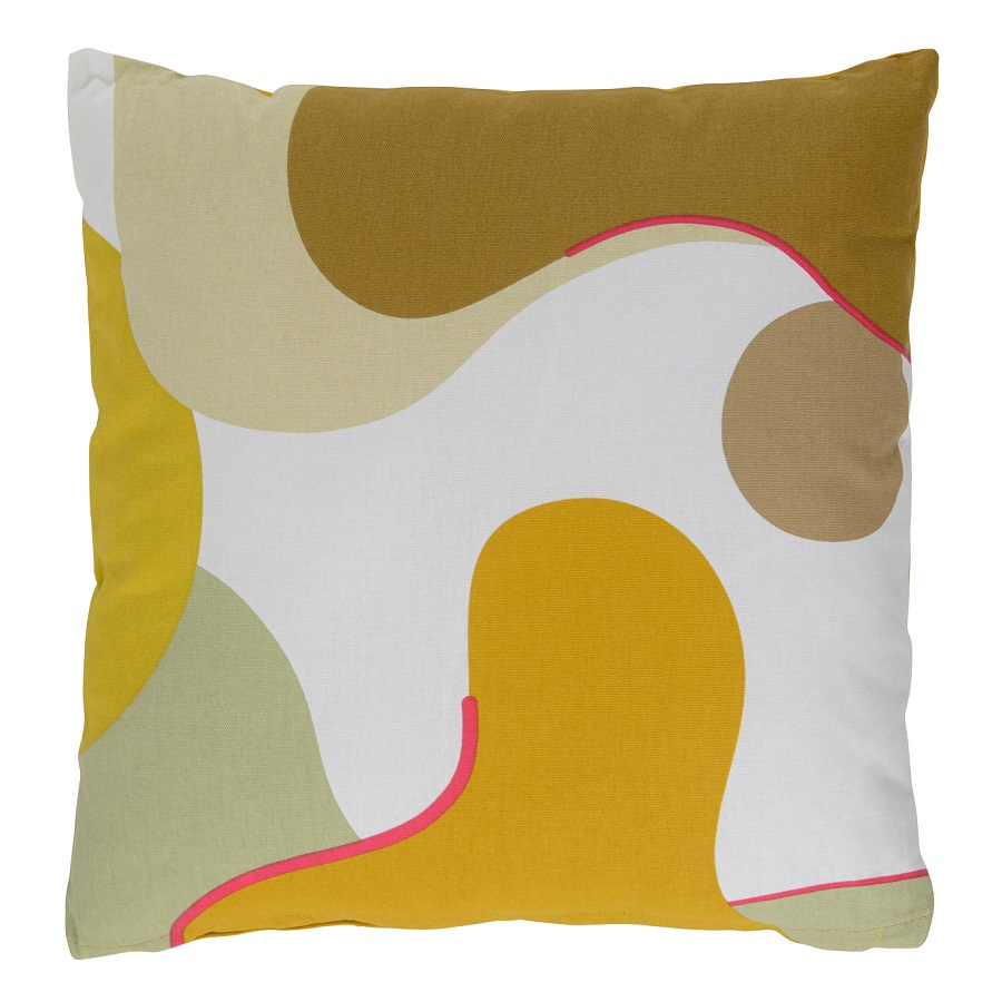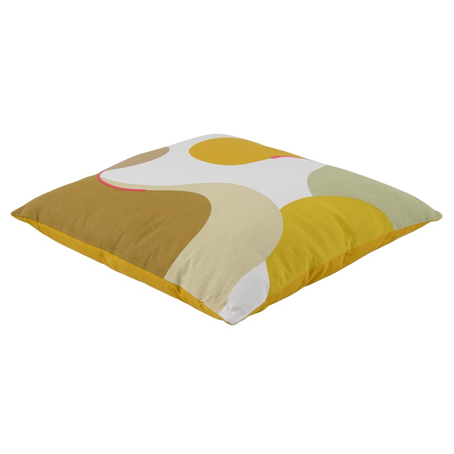 "Подушка декоративная из хлопка горчичного цвета с авторским принтом из коллекции Freak Fruit дополнит любой современный интерьер. Абстрактный принт не имеет повторяющегося раппорта и представляет собой единую законченную картину.