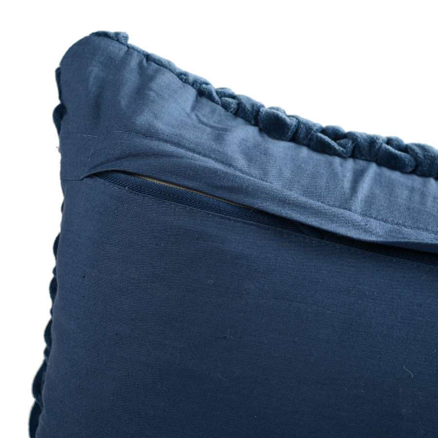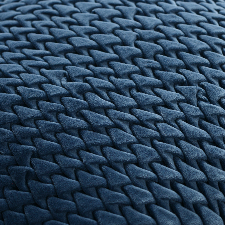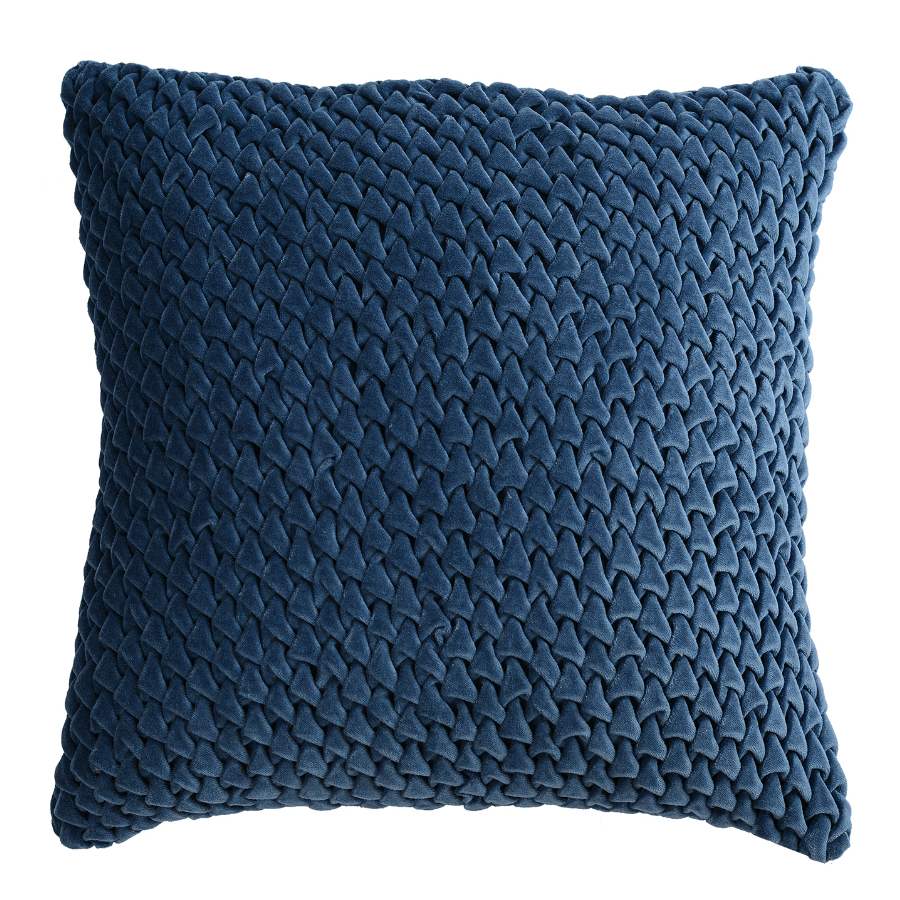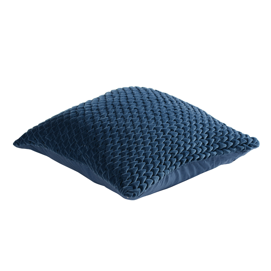 "Декоративная подушка с фактурным стеганым узором выполнена из прочного хлопкового бархата. Нежный, приятный на ощупь материал не электризуется, не вызывает аллергию, и за ним легко ухаживать. За счет плотного наполнителя изделие синего оттенка хорошо держит форму.