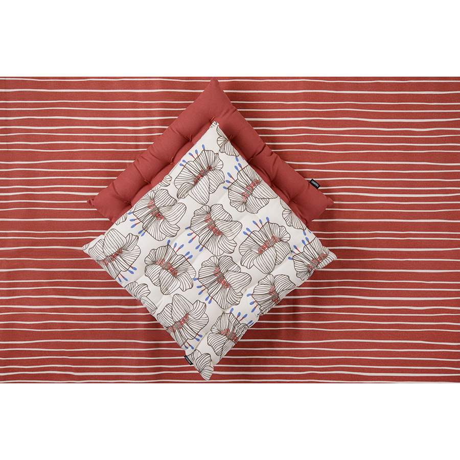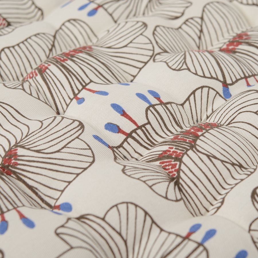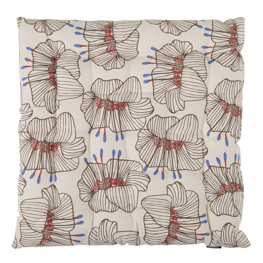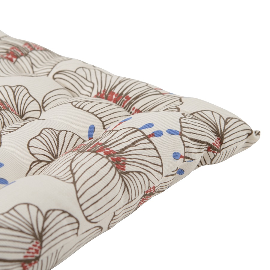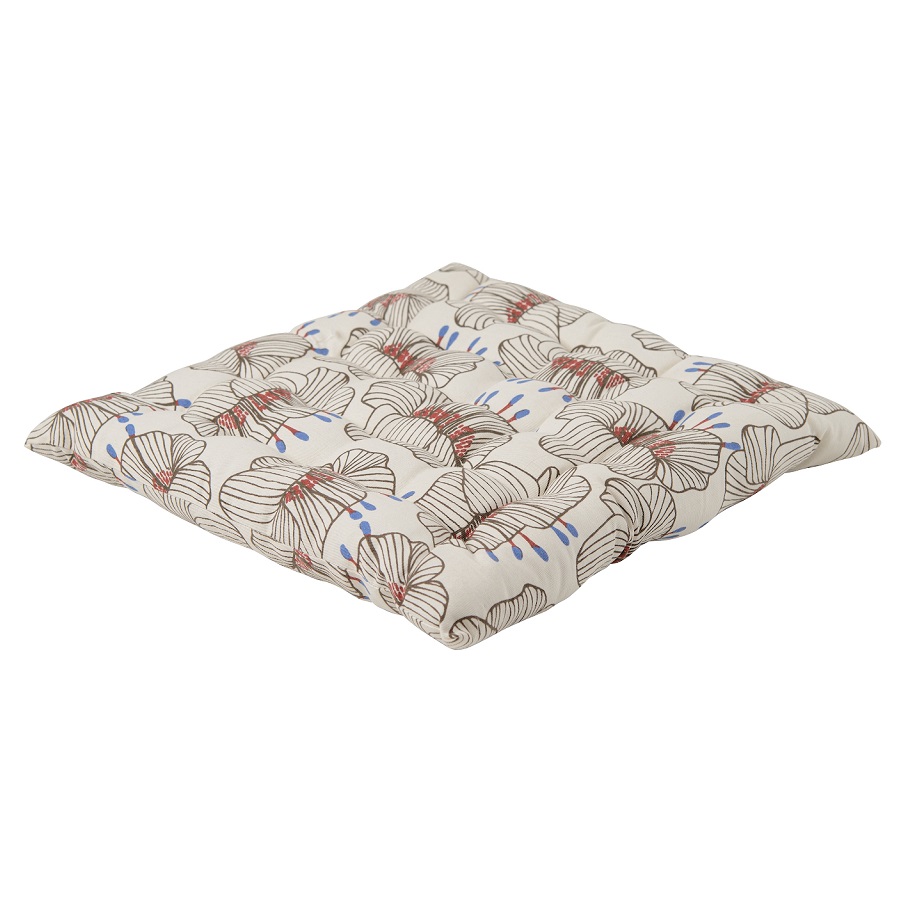 "Подушка на стул из хлопка молочного цвета с принтом Цветы из коллекции Prairie – практичное и стильное украшение кухонной мебели. Дизайн изделия с крупными цветами станет , ,ярким акцентом и гармонично впишется в , ,современный интерьер. Подушку можно использовать в качестве подкладки на деревянные или металлические стулья. Благодаря плотному наполнителю из полиэстера изделие не потеряет свою форму. Плотность ткани - 215GSM.