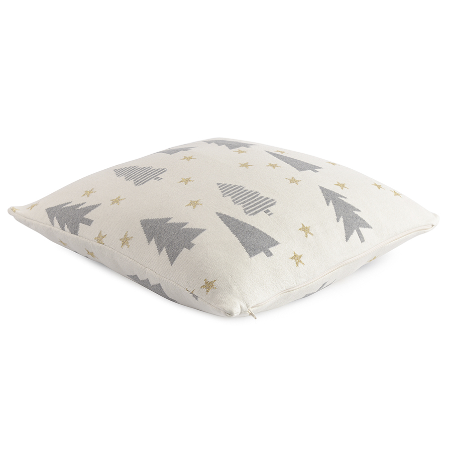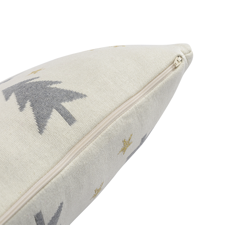 "Подушка вязаная с новогодним рисунком Magic forest из коллекции New Year Essential гармонично дополнит праздничный интерьер. Она выполнена из натурального хлопка – гипоаллергенного и приятного на ощупь материала. Лаконичный рисунок с серо-голубыми силуэтами елок на белом фоне со снежинками органично впишется в интерьер в любом современном стиле. Сбоку – скрытая застёжка на молнию. Подушку можно поддержать в интерьере пледом из той же коллекции.