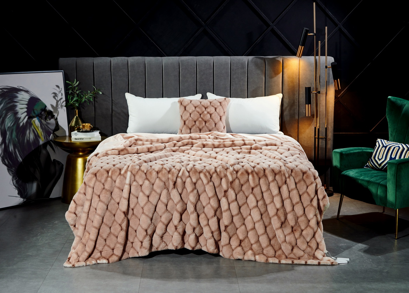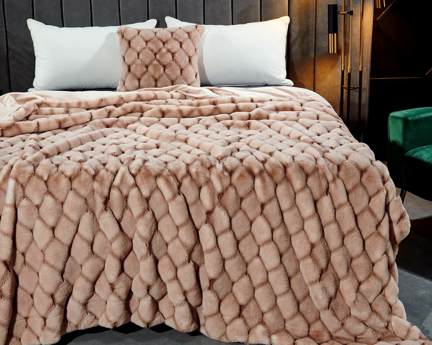 ПледРазмер: 220х240 смТкань: искусственный мехСостав: 100% вискозаПлотность: 680 гр/м2Особенности: рельефный рисунок меха, двойное окрашивание мехаУпаковка: текстильная сумкаУход: стирка 30гр.