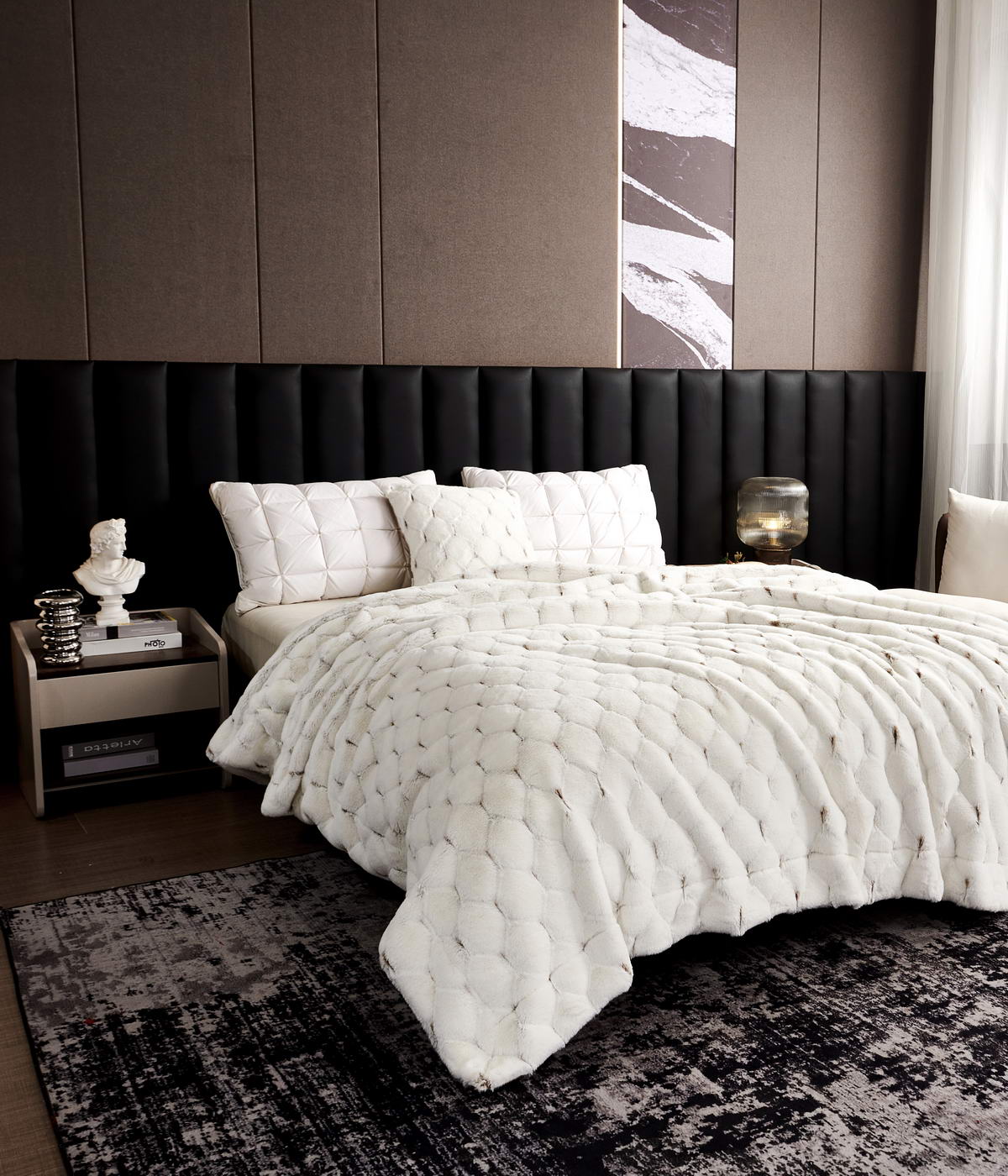 ПледРазмер: 220х240 смТкань: искусственный мехСостав: 100% вискозаПлотность: 680 гр/м2Особенности: рельефный рисунок меха, двойное окрашивание мехаУпаковка: текстильная сумкаУход: стирка 30гр.