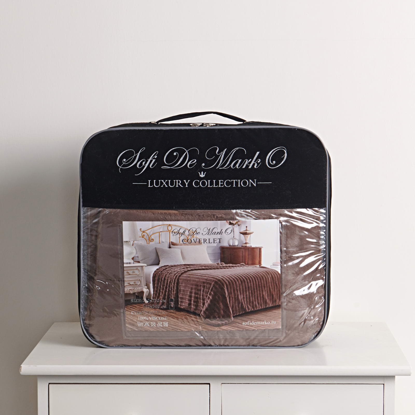 ПледРазмер: 220х240Состав: 100% вискозаОсобенности: на лицевой стороне рельефный рисунокПлотность: 600 гр.кв.мУпаковка: сумка ПВХУход: стирка 30гр.