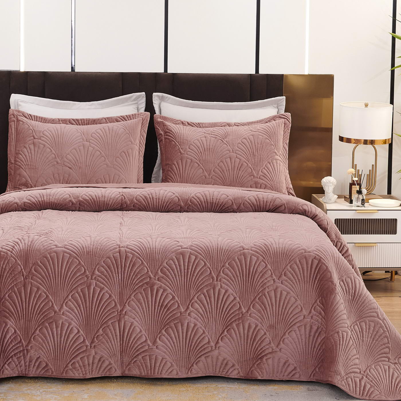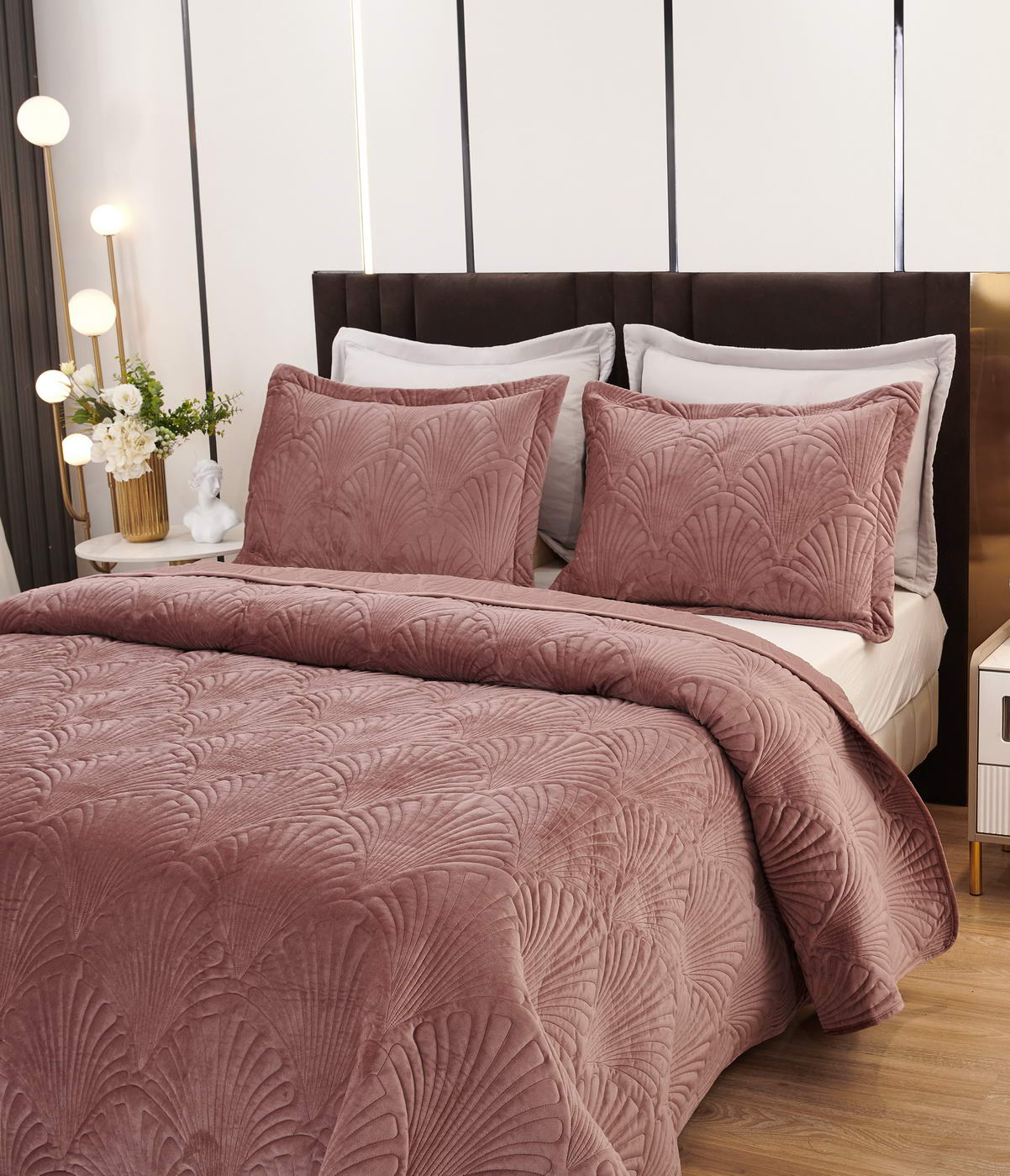 Покрывало стеганое с 3Д эффектомКомплектация:Покрывало: 240х280см (1шт);Наволочка: 50х70+5см (2шт);Плотность: 450 гр/м2 Состав ткани: 100% вискоза;Наполнитель: микроволокно;Пошив покрывала с кантом, наволочки на запахе, декорированы ушками 5смУпаковка: текстильная сумка;Уход: Стирка 30°C