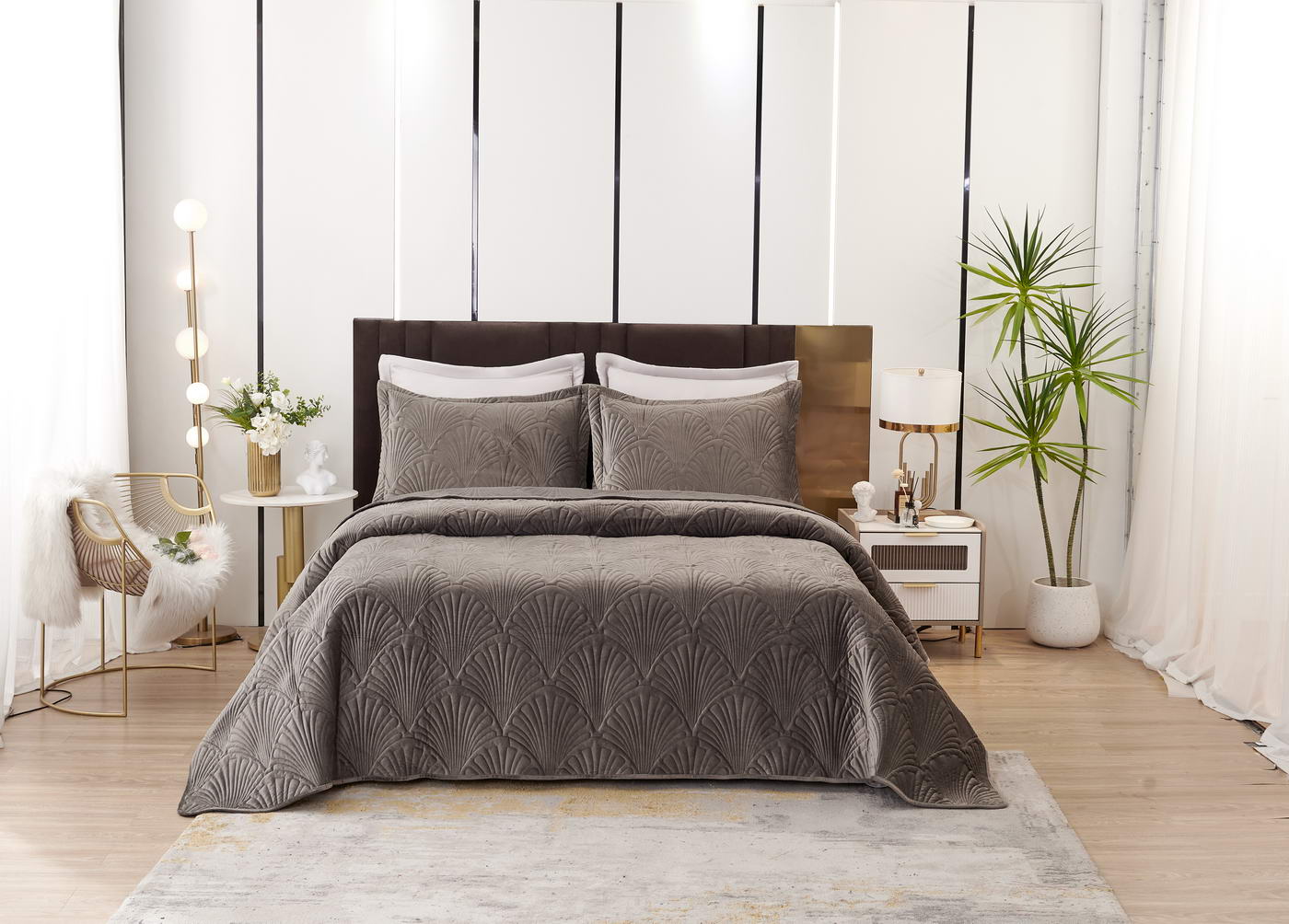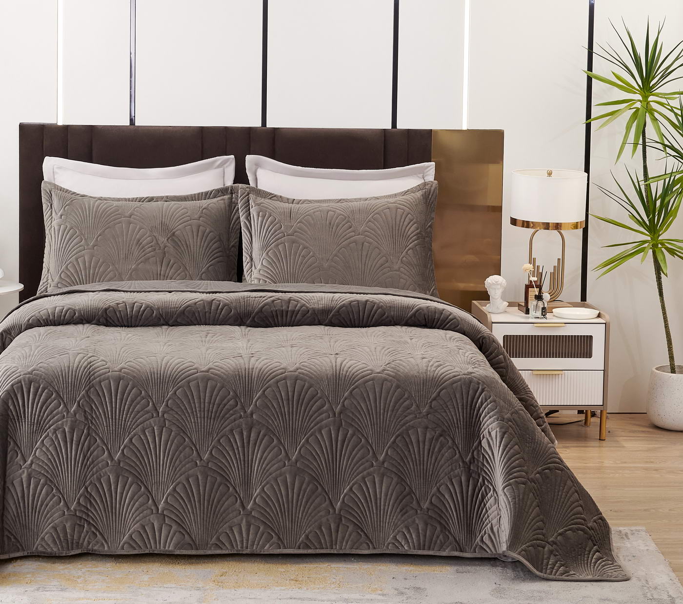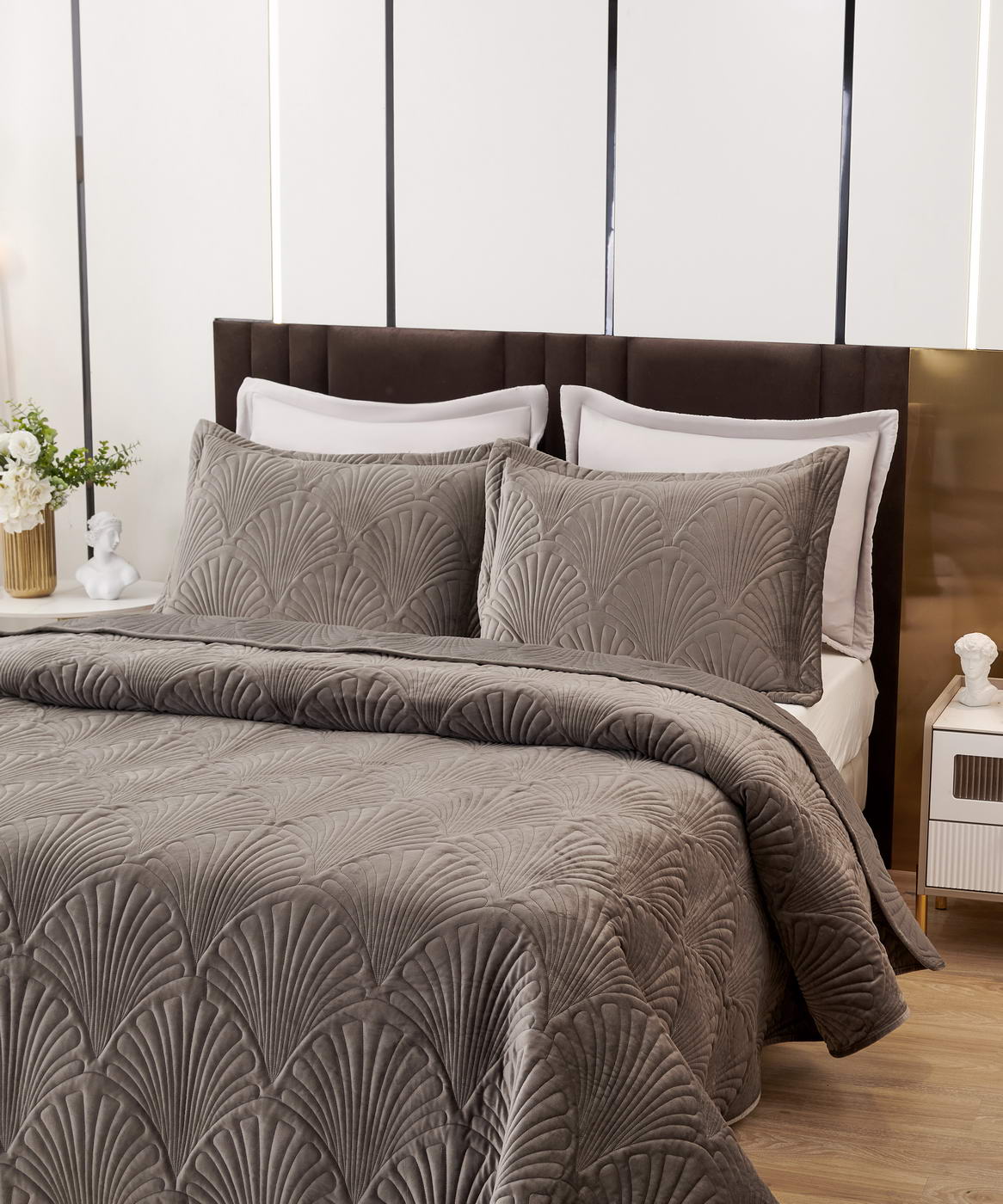 Покрывало стеганое с 3Д эффектомКомплектация:Покрывало: 240х280см (1шт);Наволочка: 50х70+5см (2шт);Плотность: 450 гр/м2 Состав ткани: 100% вискоза;Наполнитель: микроволокно;Пошив покрывала с кантом, наволочки на запахе, декорированы ушками 5смУпаковка: текстильная сумка;Уход: Стирка 30°C