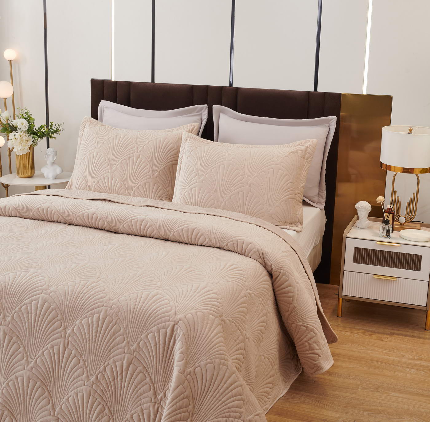 Покрывало стеганое с 3Д эффектомКомплектация:Покрывало: 240х260см (1шт);Наволочка: 50х70+5см (2шт);Плотность: 450 гр/м2 Состав ткани: 100% вискоза;Наполнитель: микроволокно;Пошив покрывала с кантом, наволочки на запахе, декорированы ушками 5смУпаковка: текстильная сумка;Уход: Стирка 30°C