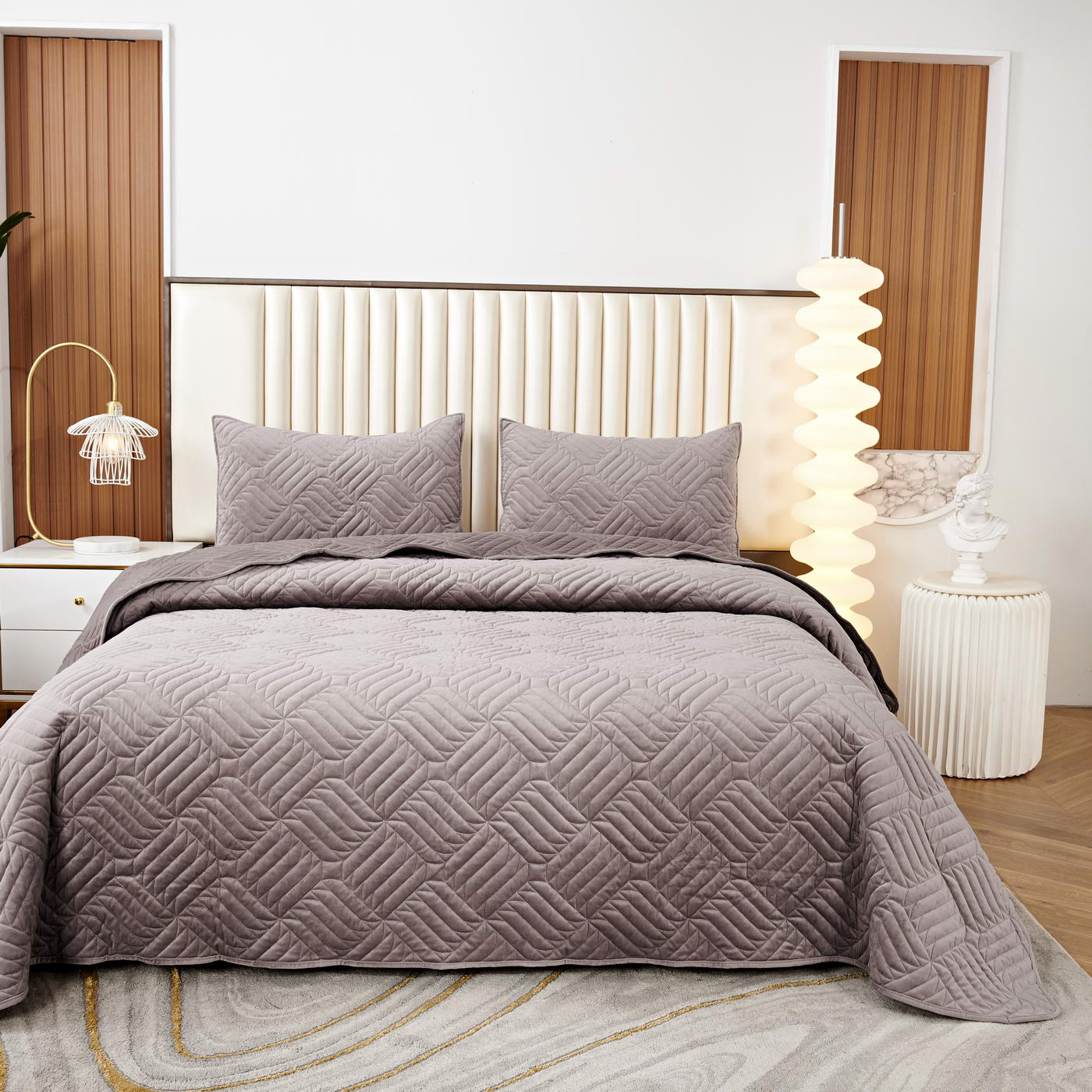 Покрывало стеганое с графическим узоромКомплектация:Покрывало: 160х220 (1);Наволочка: 50х70 (1шт);Плотность: 500 гр/м2 Состав ткани: 100% вискоза;Наполнитель: микроволокно;Пошив покрывала и наволочек с кантом, наволочки на запахеУпаковка: текстильная сумка;Уход: Стирка 30°C
