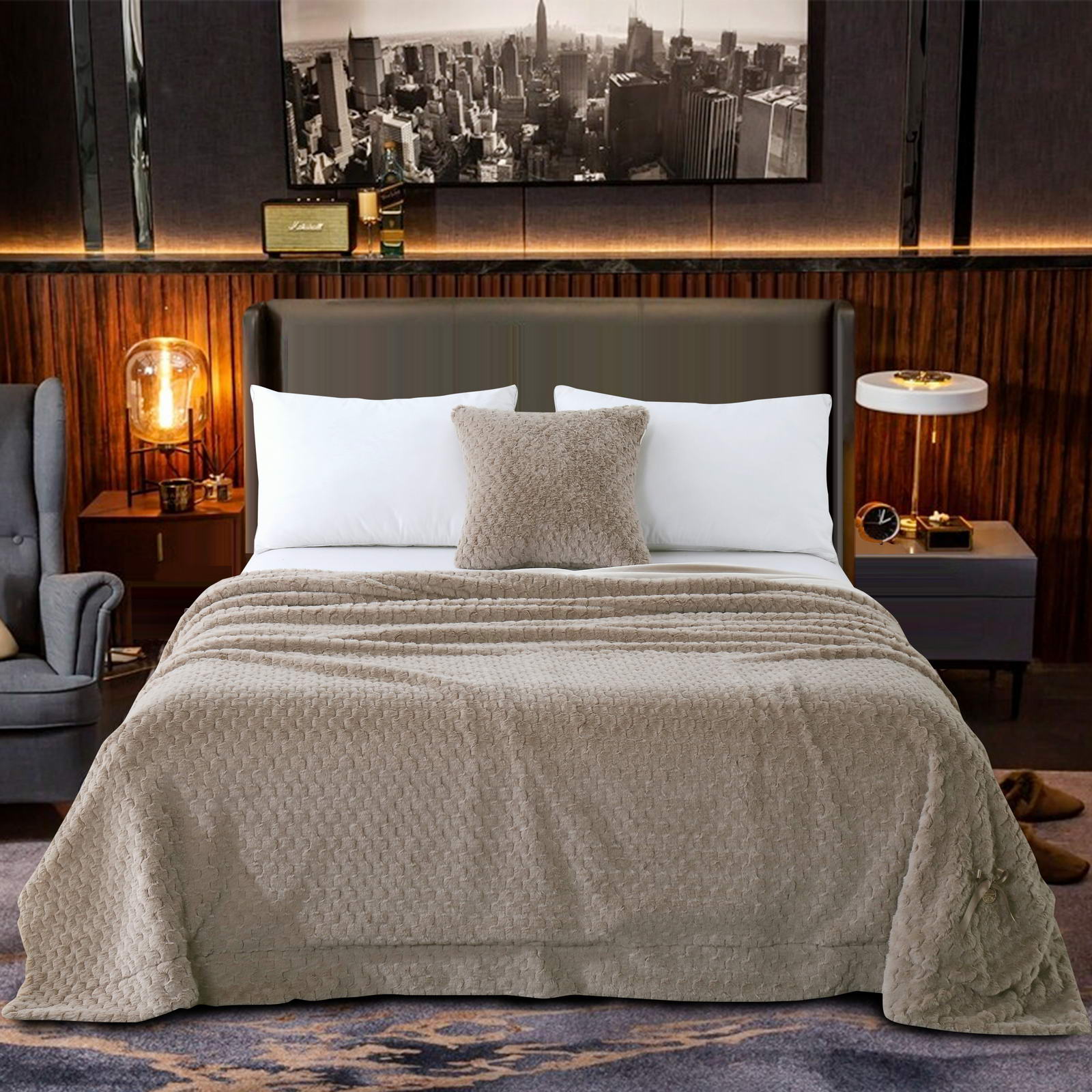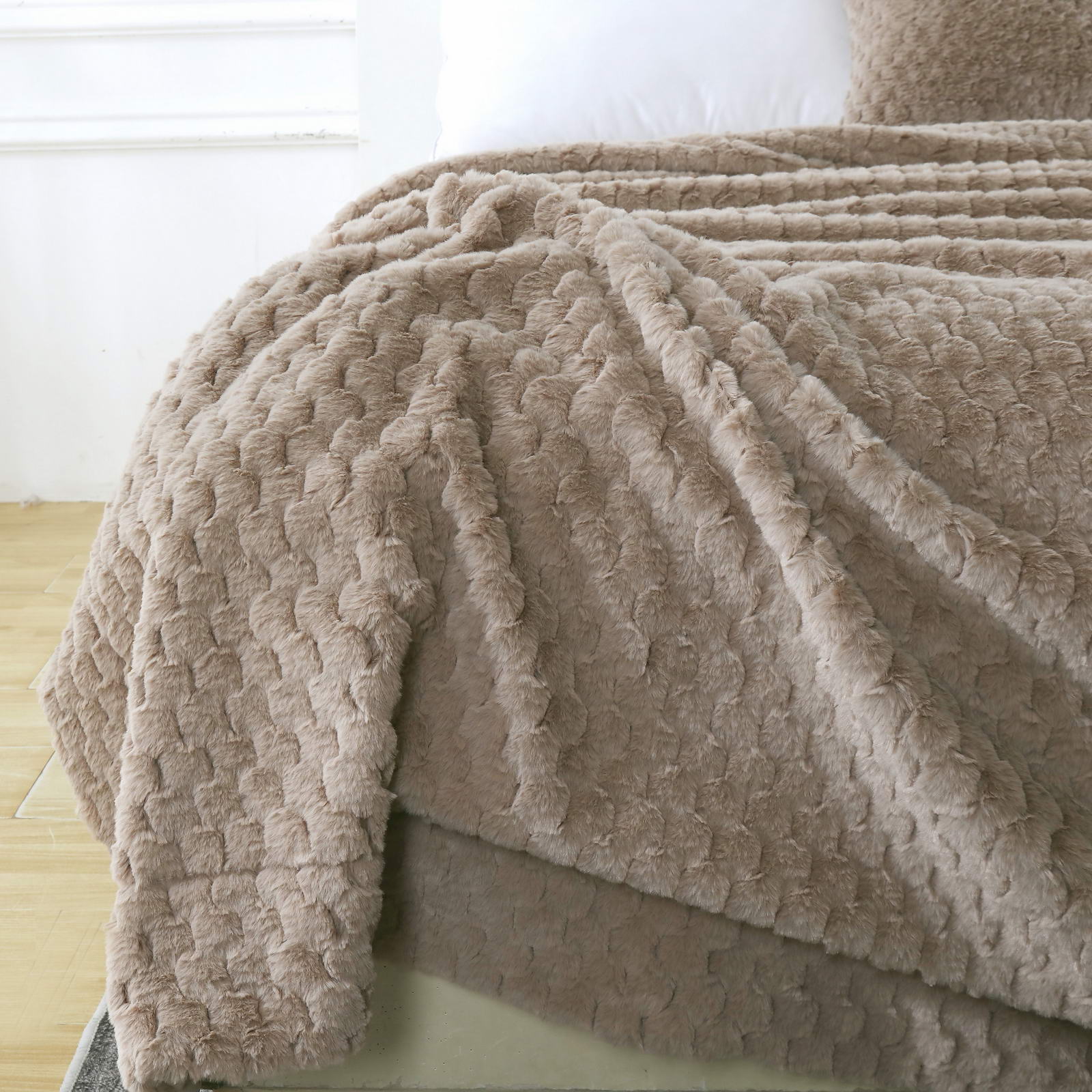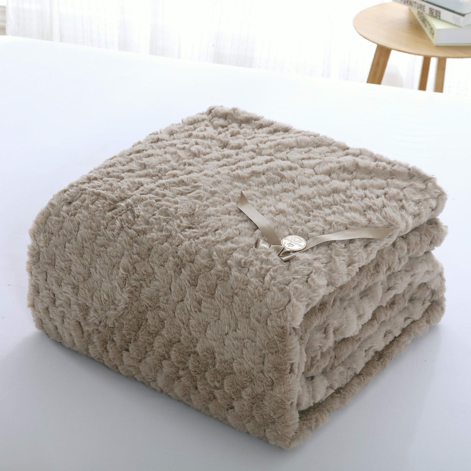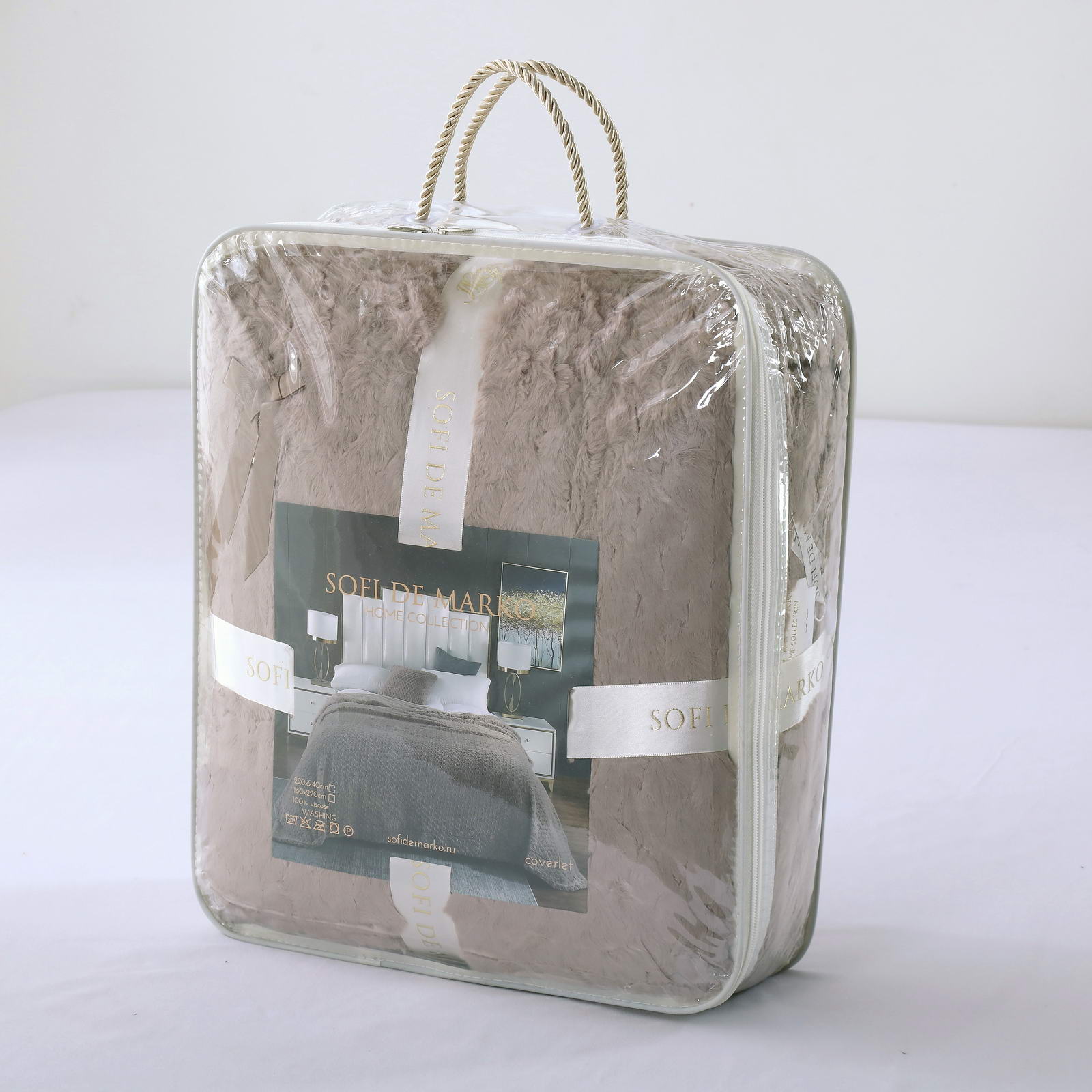 ПледРазмер: 220х240Состав: 100% вискозаОсобенности: на лицевой стороне рельефный рисунокПлотность: 420/180 гр.кв.мУпаковка: текстильная сумка Уход: стирка 30гр.
