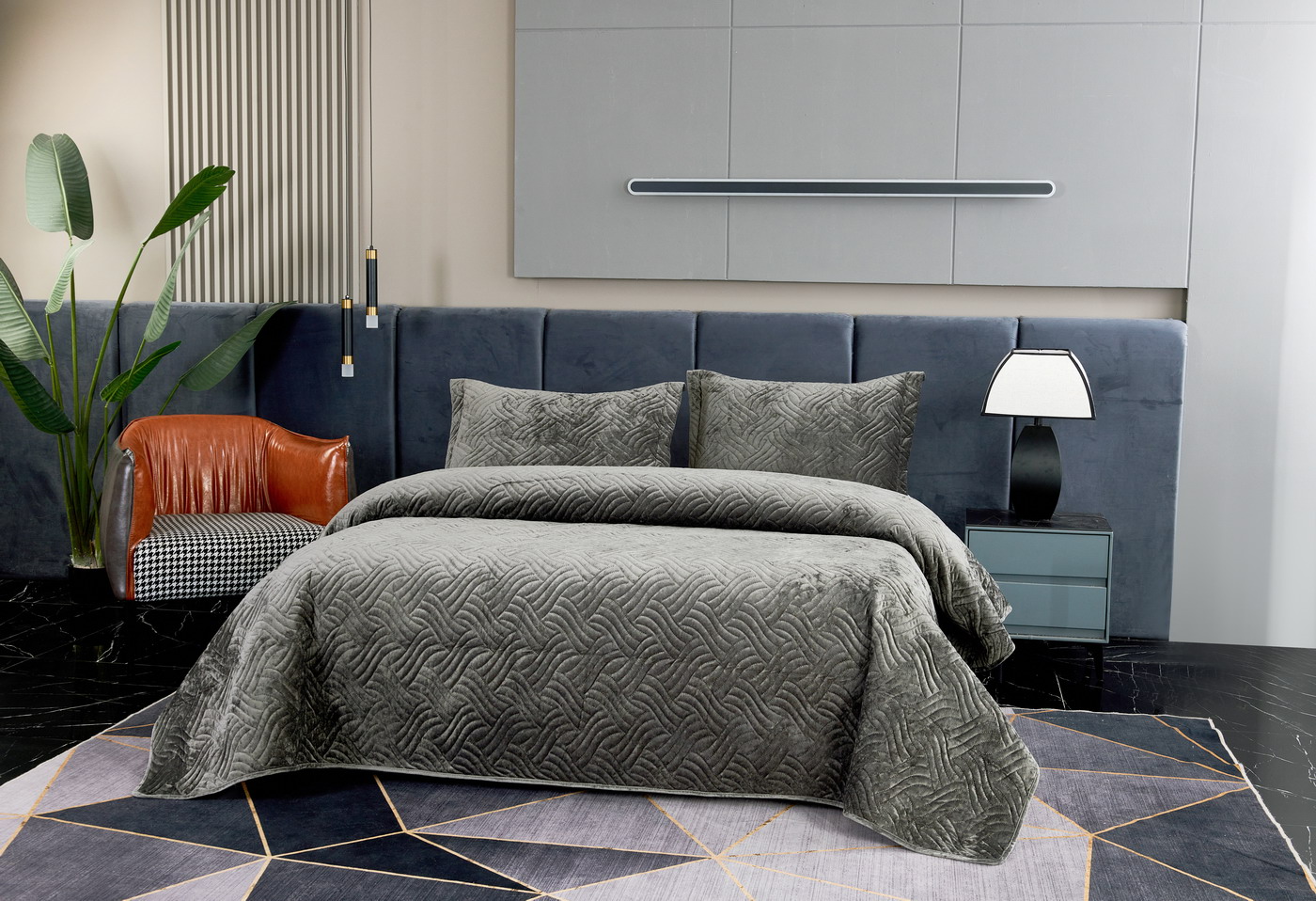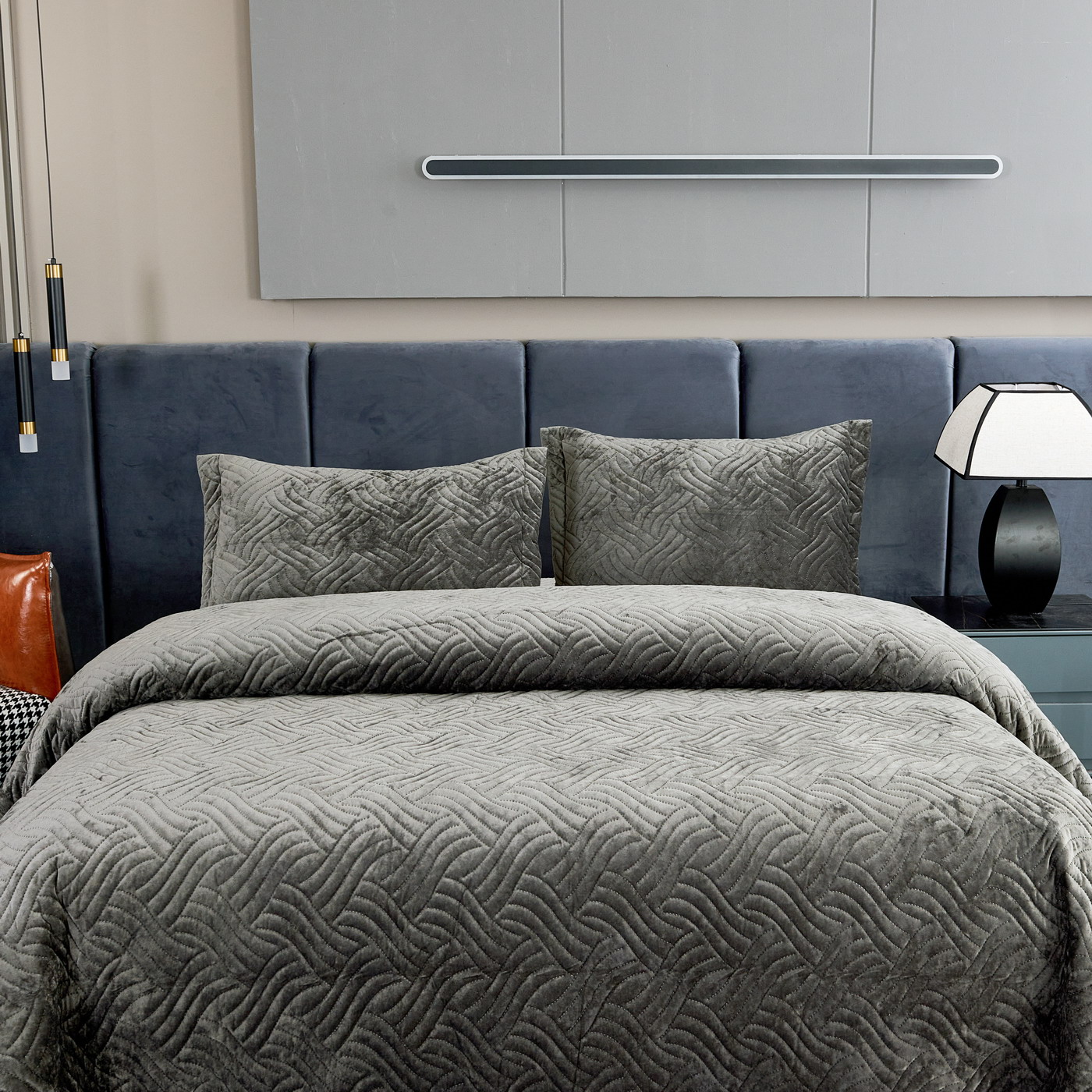 Покрывало бархатноеКомплектацияПокрывало: 240х260 см (1шт);Наволочка: 50х70 см (2шт);Плотность: 430гр/м2;Состав ткани: 100% вискоза;Наполнитель: микроволокно;Декоративная стежка косичка;Пошив покрывала с кантом, наволочки с ушками 5см;Упаковка: Текстильная сумкаУход: деликатная стирка 30°C.